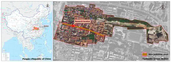 This study selected the Tanhualin commercial pedestrian street in Wuhan, China, as the research site (Figure 2), which aligns with the study’s required conditions. Wuhan is a typical high-density city. It ranks 9th in GDP among Chinese cities, with a permanent population of 13.774 million and an urbanization rate of 75.9% [54]. The Tanhualin street is a landmark destination popular with both locals and tourists. It is a safe, comfortable, and well-maintained commercial pedestrian street featuring shopping, dining, and entertainment functions, situated near numerous residential districts. We selected this pedestrian street as the study site for two main reasons. One reason is that local authorities have placed substantial emphasis in recent years on environmental upgrading and renewal in this area, making it a government-recognized and representative case. Tanhualin commercial pedestrian street is the main thoroughfare of the Tanhualin Historic District. The district has a long history, gradually taking shape after the expansion of Wuchang City in the fourth year of the Hongwu reign of the Ming Dynasty (1371). The area contains 52 historic buildings dating from the Ming and Qing dynasties as well as the early Republican period, and it was included in the third batch of “National Tourism and Leisure Districts” in November 2023 [55,56]. Another reason is that the street aligns with public perceptions of a typical commercial pedestrian street and therefore offers broader applicability. Commercial pedestrian streets are commonly characterized by independent commercial activities, diverse storefronts, public seating, and relatively wide sidewalks. In this sense, Tanhualin Street corresponds to the widely recognized and general concept of a commercial pedestrian street [40]. The specific study location is at the western entrance section of the Tanhualin Street. This spot is adjacent to an animation toy store and a jewelry store, with a café, Hanfu rental shop, and souvenir shops across the street, resulting in relatively high pedestrian flow. The entrance area was chosen to represent a typical and highly frequented node within the commercial pedestrian street.