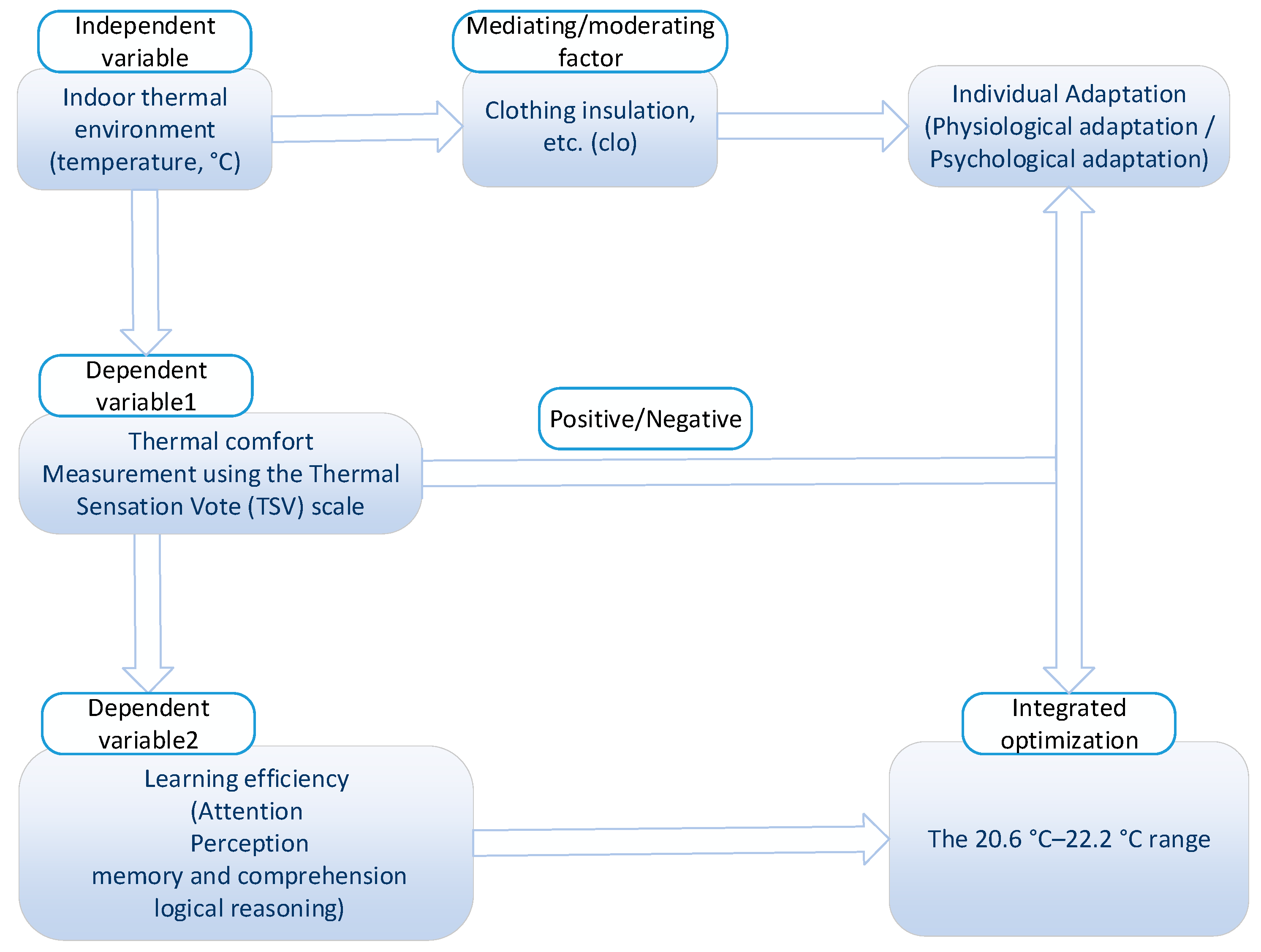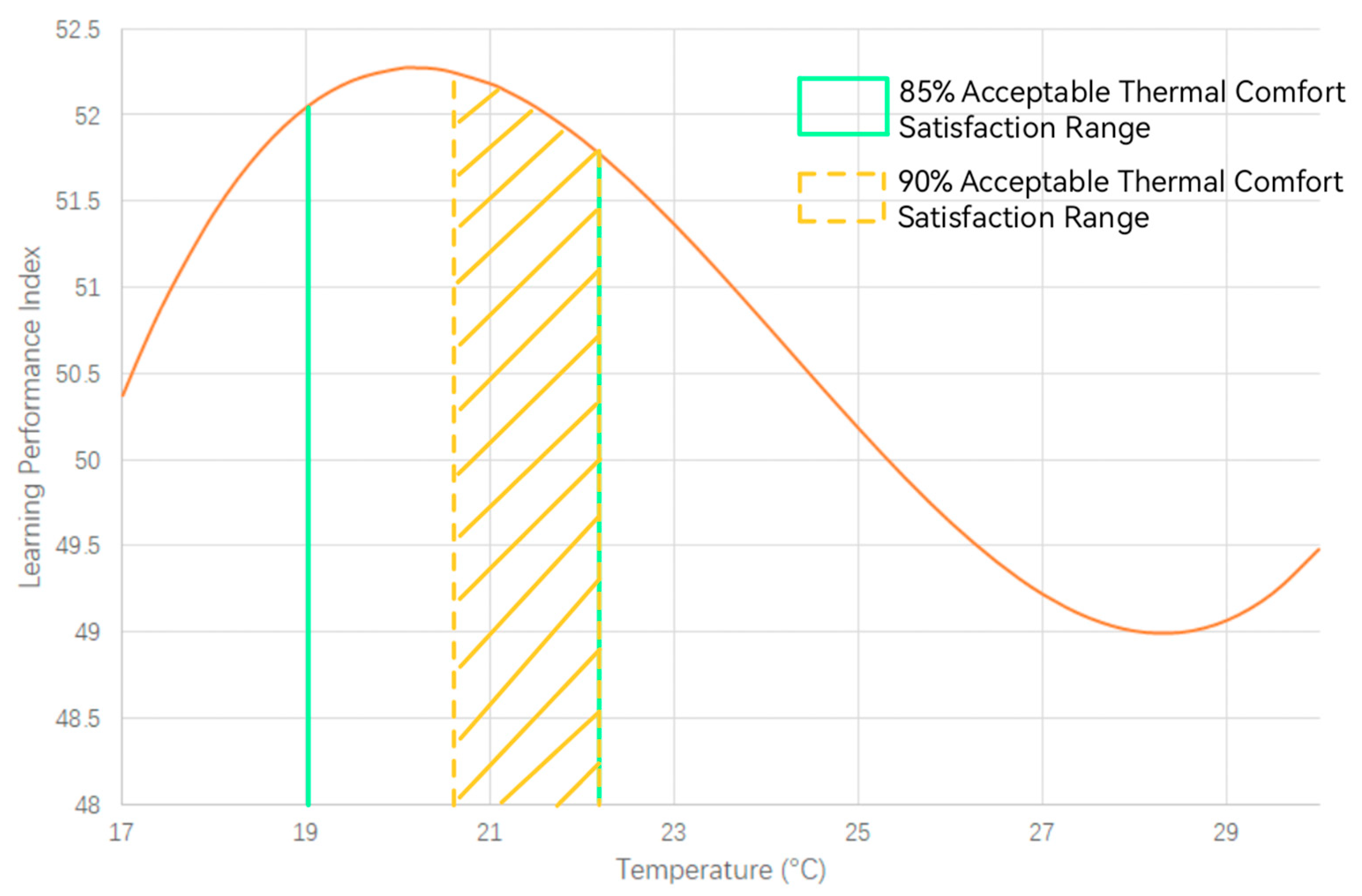 - Based on the combined optimal values for both thermal comfort and high learning efficiency, the ideal temperature range lies between 20.6 °C and 22.2 °C.