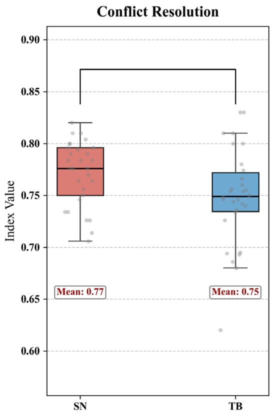 where denotes the total number of original conflict points, and represents the resolved conflict points, assigned a value of 1. is the weight ratio of a conflict point where a part of the conflict has been resolved, but not fully resolved. It is a proportion coefficient (ranging from 0 to 1) assigned by experts based on the resolution degree of the i-th conflict, according to the participants’ proposals. If the conflict is fully resolved, = 1; if partially resolved, takes the corresponding proportion, with ∈ [0, 1]. The original conflict points include the intersection of pedestrian flow and vehicle flow, congestion during peak hours, fire channel blockage, etc., which are defined by experts.