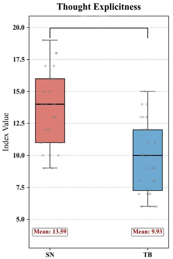 - For the TB group: Through experimental recording transcription, sketch annotation text, and retrospective interview records, “clearly categorizable design concepts + corresponding logical explanations” are extracted as effective cognitive units. Two independent coders identified these units following the same “logical closed-loop” standard as the SN group.