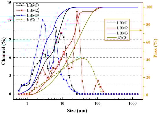 The particle size distribution curves of LBM and EWS samples are presented in Figure 2; these measurements were performed using a laser diffraction analyzer (Micromeritics S3500, Norcross, GA, USA), which is widely used in the industry and has a measurement range of 0.02–2800 μm. The particle size ranges of LBM1, LBM2, LBM3, and EWS are 0.49–26.16 μm, 1.16–176.0 μm, 0.49–31.11 μm, and 0.98–127.0 μm, respectively. The mean particle size calculated by the volume of LBM1, LBM2, LBM3, and EWS were 5.86 μm, 18.16 μm, 4.09 μm, and 22.90 μm, respectively. The specific surface area and pore characteristics of various LBM and EWS samples were determined via N2 adsorption–desorption measurements using a Micromeritics ASAP 2460 analyzer (Micromeritics Instrument Corporation, Norcross, GA, USA), with the Brunauer–Emmett–Teller approach (BET) method applied for calculations. The results are shown in Table 2 and Figure 3. For LBM1 and LBM3, the smaller the Brunauer–Joyner–Halenda (BJH) adsorption average pore diameter, the larger the BET surface area. And the content of reactive MgO was fully consistent with the BET surface area—the larger the BET surface area, the higher the content of reactive MgO.