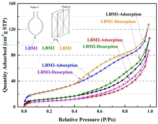 Different hysteresis curves occur due to different pore structures in particles according to the theory of adsorption and condensation [42,43,44]. During the calcination of magnesium compounds (magnesium carbonate, basic carbonate, and hydroxide), the loss of gases (water and CO2) from 300 °C to 500 °C leave high porous structures with a large internal surface area and reactivity between MgO cells (groups of cells) [12]. The physisorption isotherms of the three kinds of LBM samples were Type IV, according to the hysteresis loop characteristics [42]. Important information about the pore structure can be obtained from the shape of the hysteresis loop [43]. For the pore structure of LBM3, the shape of the hysteresis loop was Type H2 [42], the shape of the hysteresis loop indicates a mesoporous structure (pore widths from 2 nm to 50 nm; Figure 3) with narrow necks and wide bodies. The pore structure of LBM3 looked like an ink bottle (named an ink bottle pore, i.e., Pore-1 in Figure 4) [43,44]. The shapes of the hysteresis loops of LBM1 and LBM2 were Type H3 [42]. There were some plate-like particles with slit-shaped pores (named slit pores, i.e., Pore-2 in Figure 4) [43,44].