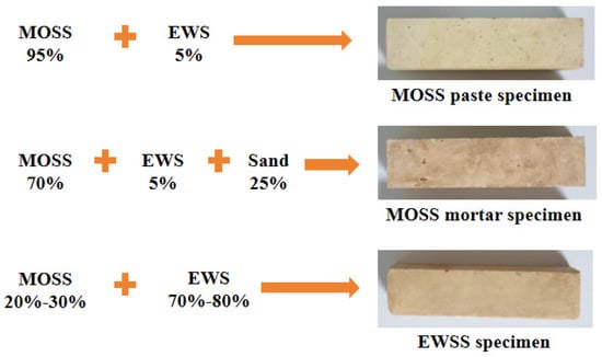 For the setting time, heat hydration, and compressive strength tests of MOSS pastes, the mole ratio of MgO to MS was varied from 7 to 9 at intervals of 1, the water-to-MS mole ratio fixed at 20 and the weight ratio of EWS set at 5%; these mix proportions are summarized in Table 3. For compressive strength tests of MOSS mortar (using Chinese ISO standard sand), the MgO-to-MS and water-to-MS mole ratios were set to 8 and 20, respectively, while the weight ratios of the EWS and standard sand were 5% and 25%; the corresponding proportions are listed in Table 4. For EWSSs, the MgO-to-MS and water-to-MS mole ratios were fixed at 8 and 20, respectively, and the EWS weight ratio was adjusted to 70%, 75%, and 80%; detailed mix proportions are presented in Table 5. In the NO. of Table 3 and Table 5, “S” represents the engineering waste soil stabilized by MOSS. In the NO. of Table 4, “SS” represents the engineering waste soil and sand stabilized by MOSS. In the NO. of Table 3, Table 4 and Table 5, the first digit represents the MgO-to-MS molar ratio, the second digit denotes the weight ratio of engineering waste soil, and the third digit indicates the type of light burned magnesia (LBM). Figure 5 presents the composition and photographs of the specimens.