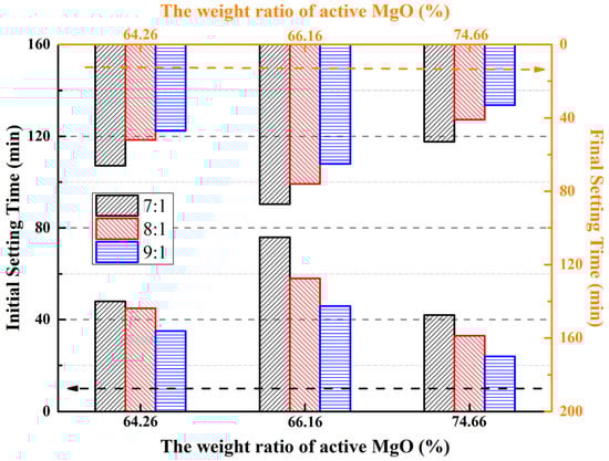Only reactive MgO in LBM can react with magnesium sulfate in aqueous solutions [31,50]. The reactive MgO may be influenced by lattice dilation and imperfections produced during low-temperature calcination [12]. Different contents of reactive MgO lead to different setting times and compressive strengths of MOSS pastes; therefore, setting time tests were carried out using three different reactive MgO contents in LBM. The results are shown in Figure 6.