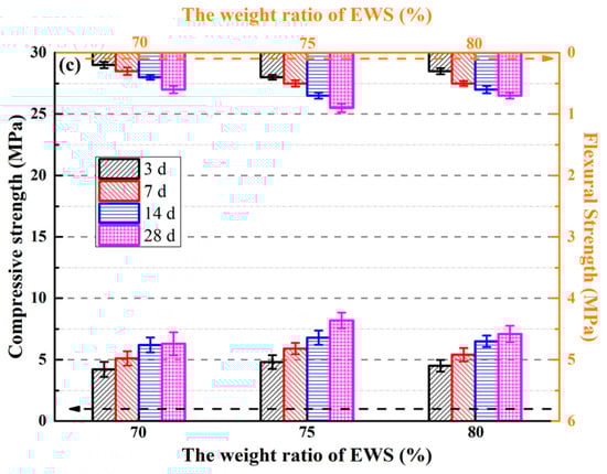 For the MOSS pastes, the compressive and flexural strengths were highest when the MOSS paste was made using LBM2 (Figure 7a), which is almost identical to the results of Reference [20]. Moreover, the highest compressive and flexural strength was obtained using the MOSS mortar with LBM2 (Figure 7b). The compressive strength of the paste and mortar of the MOSS were all higher than 10.8 MPa and 11.6 MPa, respectively, in Figure 7. For MOSS mortar, the compressive and flexural strengths were all higher than that of the MOSS paste. The 28 d compressive and flexural strengths of the MOSS mortar were 20.3–25.4% and 57.1–73.3% higher than that of the MOSS paste when MOSS mortars were mixed with 5% EWS and 25% sand. Nevertheless, with the weight ratio of EWS increasing from 5% to 80%, the compressive and flexural strengths of EWSS pastes at the curing age of 28 days were reduced by 47.0% and 53.3% relative to the reference MOSS paste.