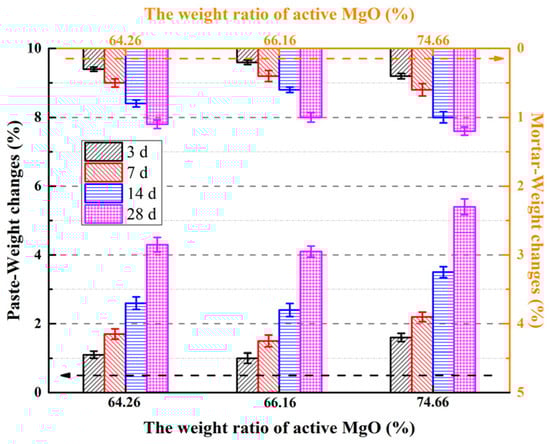 For most of the MOSS paste or mortar samples, the weight loss ratio increased with the curing time (Figure 8). Free water in the pores of LBM and MOSC paste and mortar evaporated upon prolonging the curing time [20]. The weight changes in the MOSS paste and mortar with LBM3 were the largest during different curing times. The highest weight loss ratio of the MOSS paste and mortar was 5.4% and 1.2%, respectively, when MOSS was mixed with LBM3 and then cured for 28 d. This may be because LBM3 had ink bottle pores and could absorb much more free water from the fresh MOSS paste and mortar. Upon increasing the curing time, more free water could escape from these pores, causing the weight loss to increase. The BJH average pore diameters of LBM2 were larger than those of LBM1 and LBM3, which allowed LBM to more easily release free water from the fresh MOSS paste and mortar. Therefore, the weight change in the MOSS paste mixed with LBM2 was the smallest among the different kinds of MOSS paste and mortar.