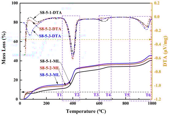 To elucidate the mechanisms underlying the compressive strength variations in MOSS with different reactive MgO contents in LBM, as well as the phase composition changes in MOSS pastes, thermogravimetric and differential thermal analysis (TG-DTA) was performed on selected samples, with the results presented in Figure 12 and Table 10. When the MgO-to-MS molar ratio exceeded 8:1 (Figure 12), the reaction of MS raw materials yielded trace amounts of MgSO4·6H2O and MgSO4·7H2O [20]. Some Mg(OH)2 may have come from LBM, and the others originated the reaction of reactive MgO with H2O. In addition, SiO2 were mainly produced by impurities in LBM, MS, and EWS (Table 1). However, the carbonization of Mg(OH)2 can produce some MgCO3 [31,36,46,47,50]. Calcium sulfate dihydrate (CaSO4·2H2O) can be generated from the MS raw materials as well as the hydration reactions of impurities present in both LBM and MS [12,37,47]. Furthermore, the 3Mg(OH)2·MgSO4·8H2O phase (designated as the318 phase) and other crystalline phases were barely detectable in any of the MOSC pastes [20,39]. Similarly, none of the MOSS paste samples in this study contained 318 phase or other phases (Figure 12). According to the TG-DTA results in Figure 12, the decomposition products are listed in Table 10.