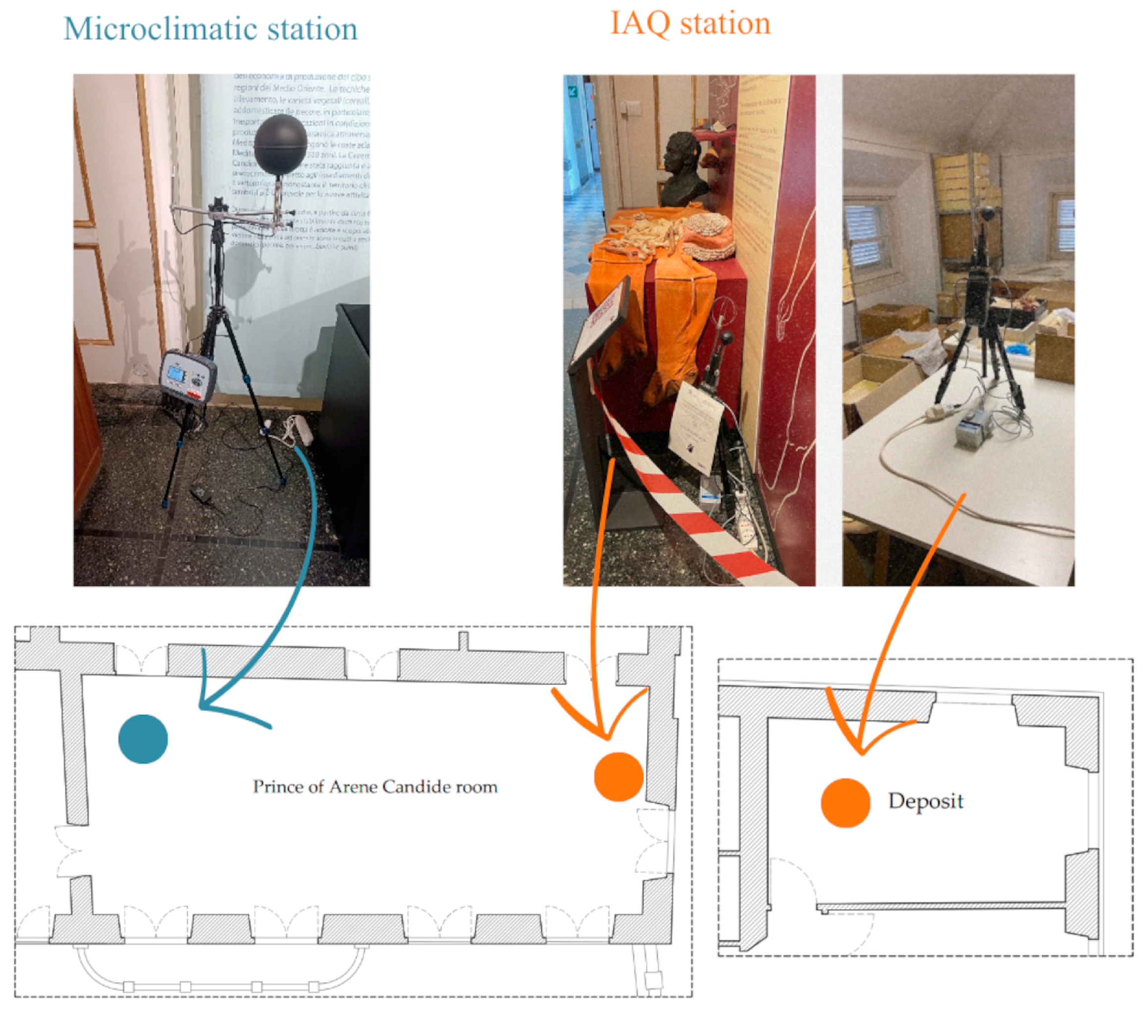 - IAQ Station [48]: a datalogger with Particulate Matter PM1, PM2.5, and PM10 Transmitter and a combined CO2 (0–5000 ppm, ±50 ppm + 3%), relative humidity (0 ÷ 100%, ±2%), temperature (−20 ÷ 80 °C, 0.1 °C), radiant temperature (−30 ÷ 120 °C, 0.1 °C), atmospheric pressure probe (300 ÷ 1250 hPa, ±0.5 hPa), TVOCs index (0–500). One of these was placed in a corner of the PoAC Room and one in the middle of the deposit.