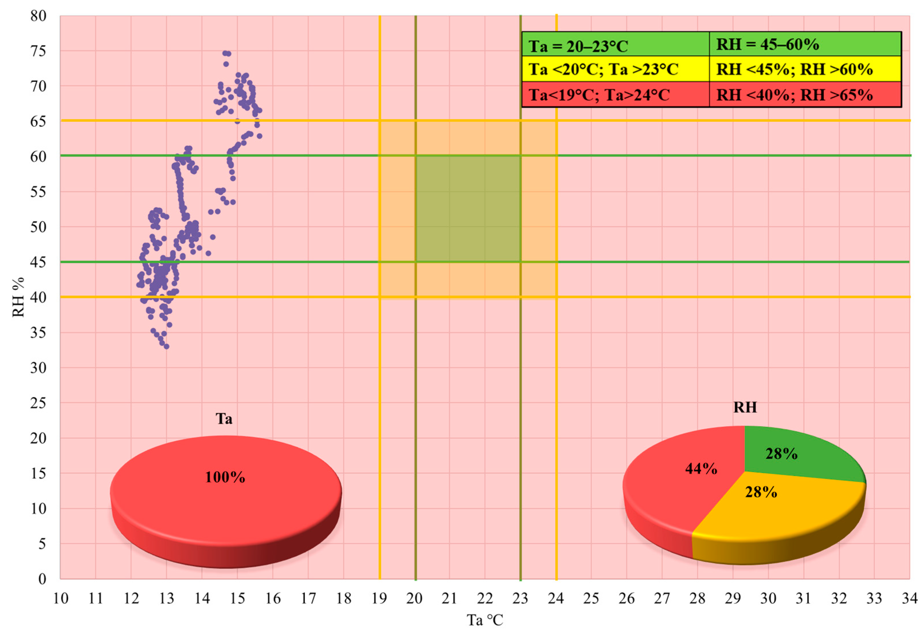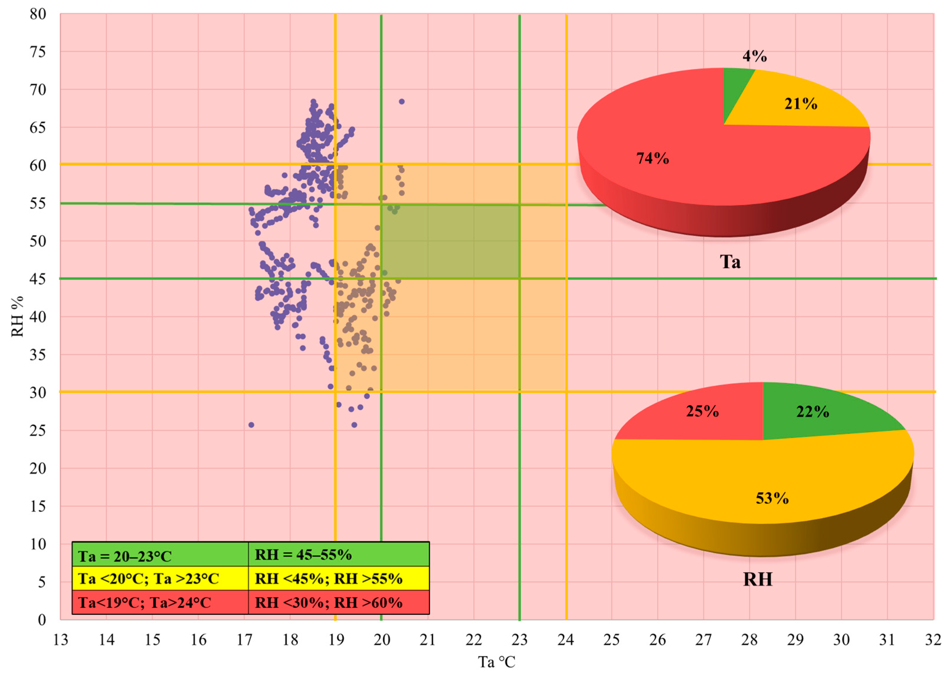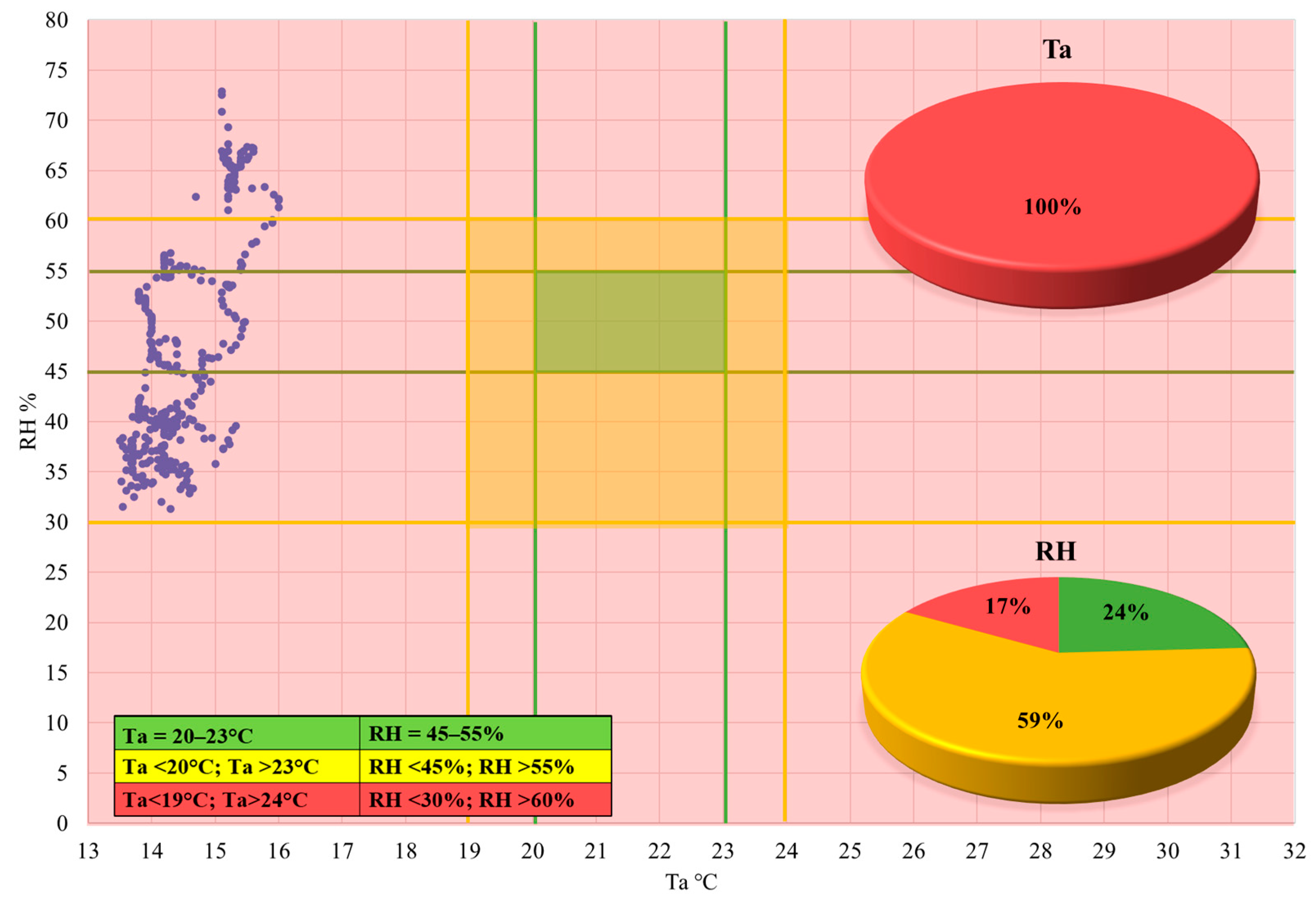| Material of Preserved Artifacts | Ta (°C) | ΔTamax (°C) | RH (%) | ΔRHmax (%) | Emax (lx) | UVmax (µW/lm) | LOmax (Mlx/h yr) | Ref. Standard UNI 10829:1999 | Ta (°C) | RH (%) | Ref. D.M. 10.05.2001 |