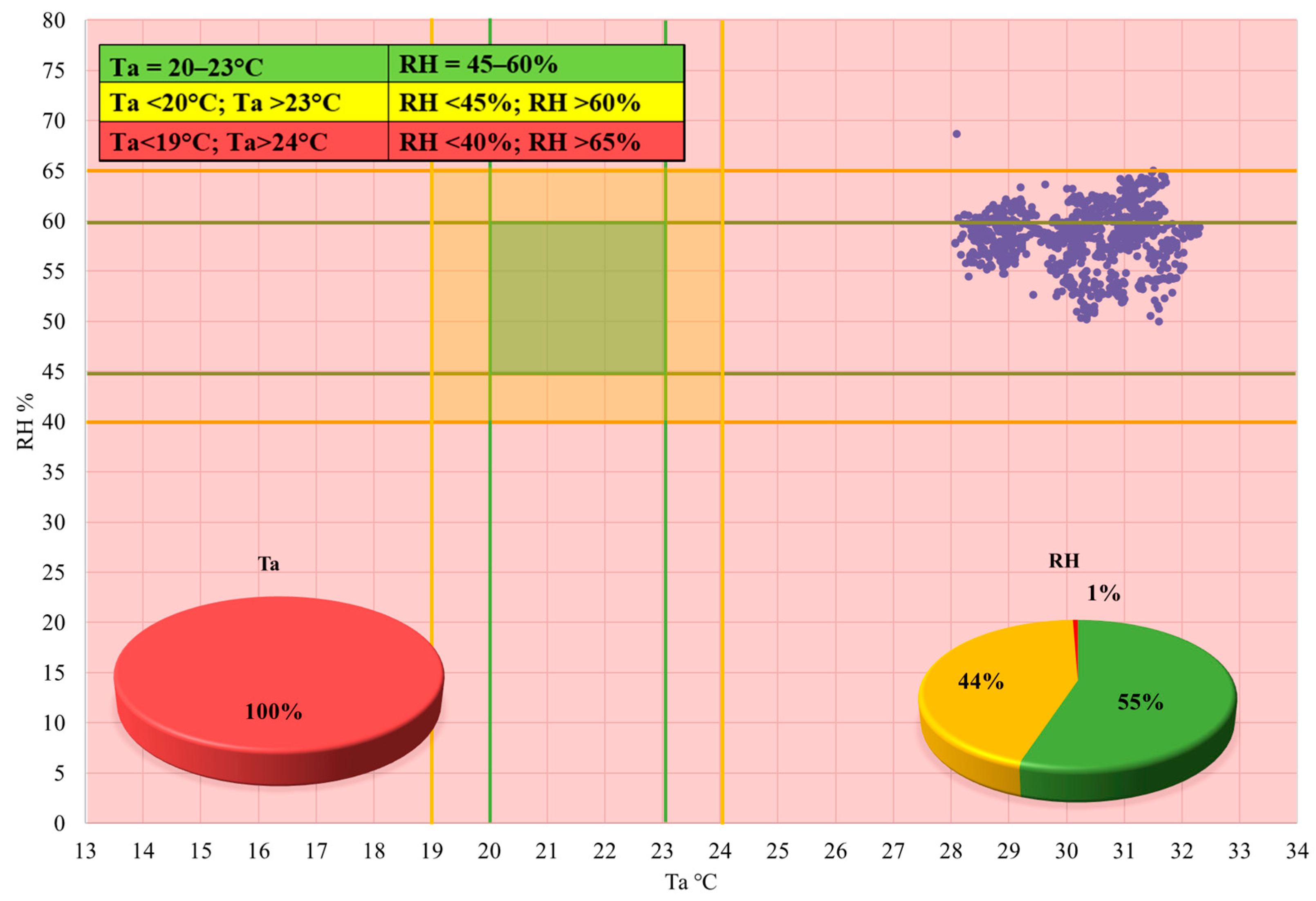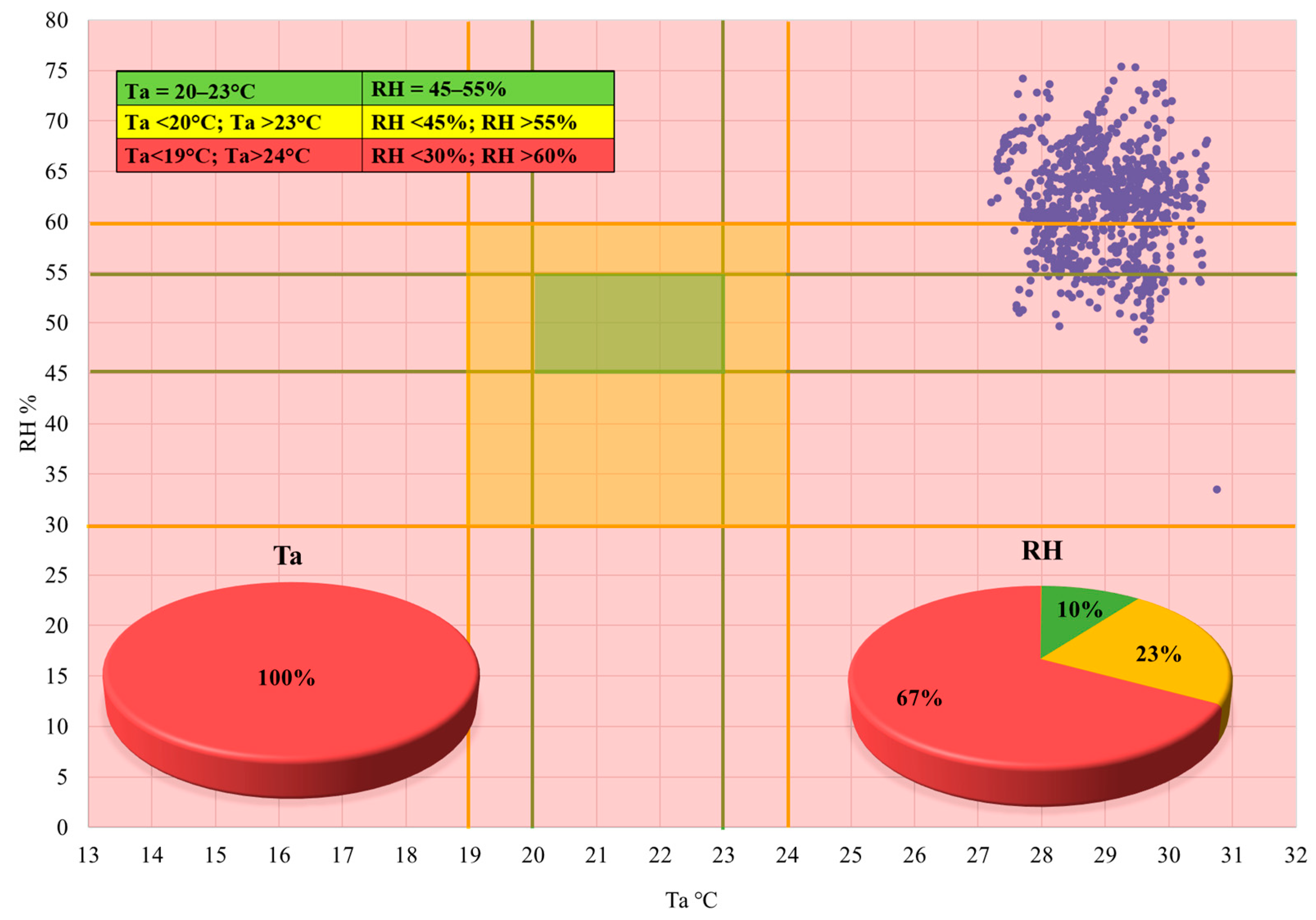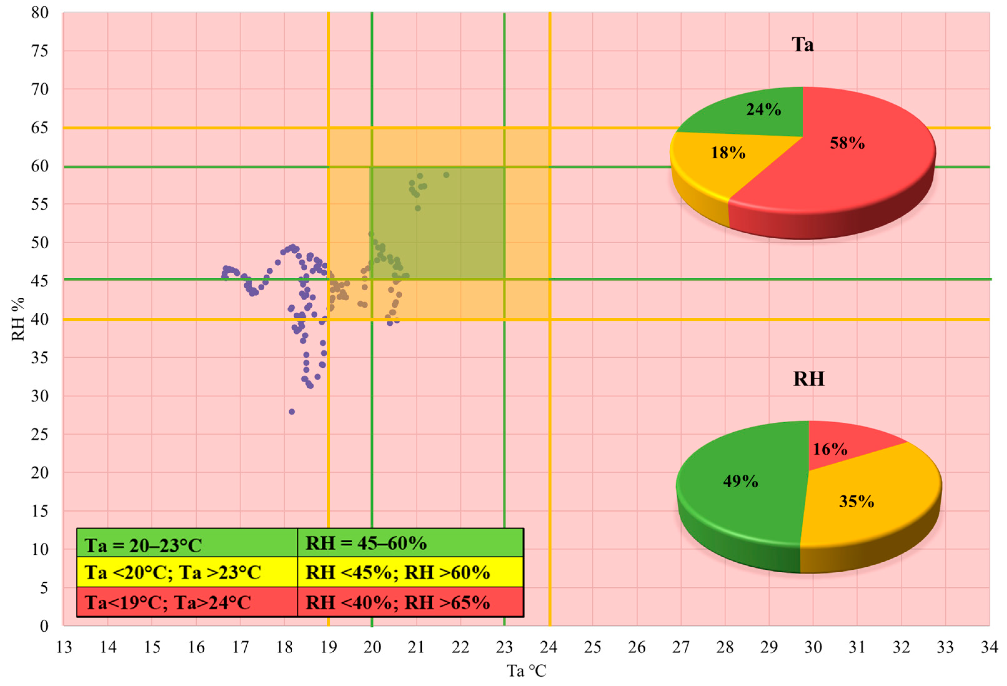 | Material of Preserved Artifacts | Ta (°C) | ΔTamax (°C) | RH (%) | ΔRHmax (%) | Emax (lx) | UVmax (µW/lm) | LOmax (Mlx/h yr) | Ref. Standard UNI 10829:1999 | Ta (°C) | RH (%) | Ref. D.M. 10.05.2001 |