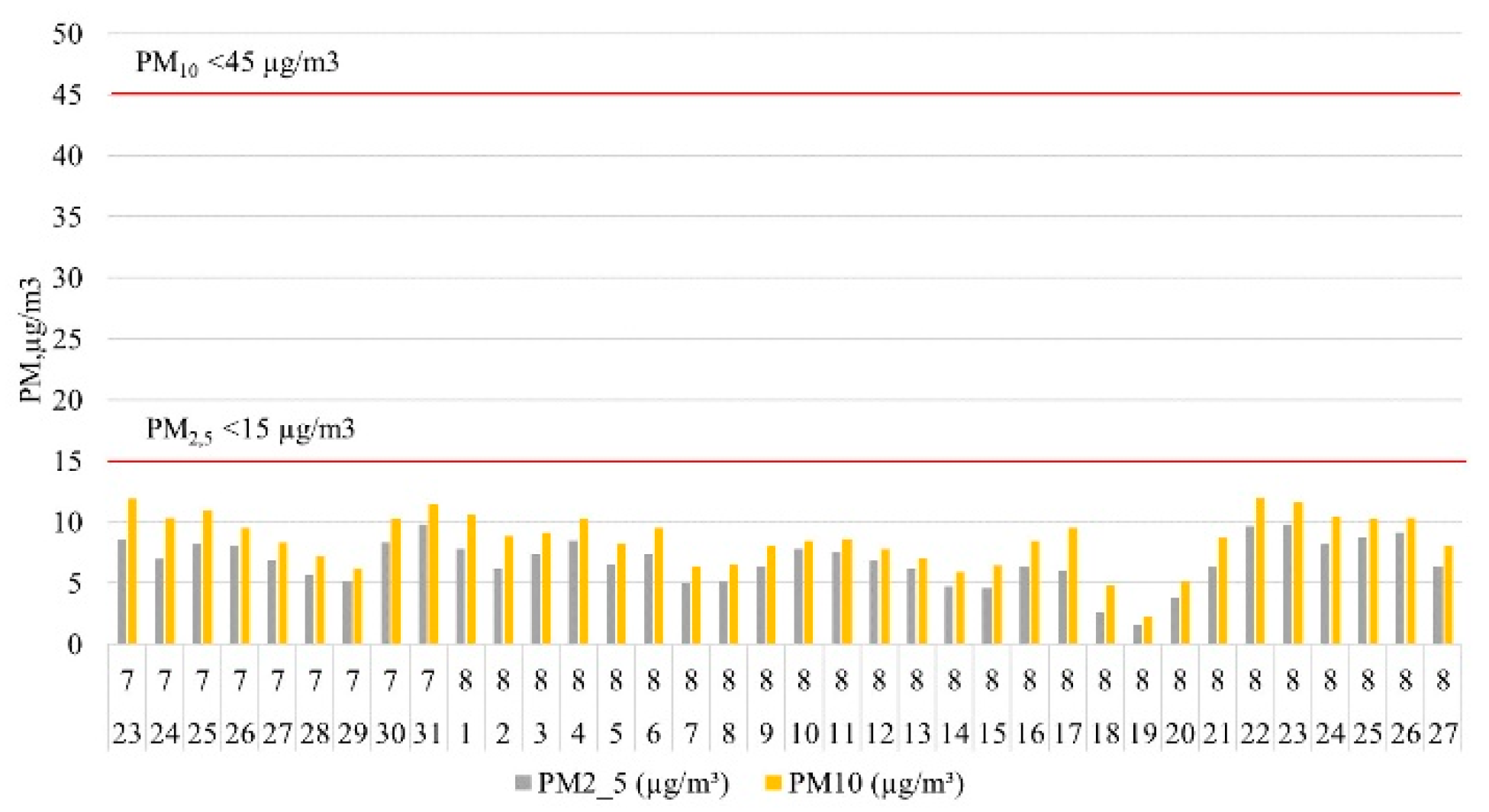 - World Health Organization. WHO Global Air Quality Guidelines: Particulate Matter (PM2.5 and PM10), Ozone, Nitrogen Dioxide, Sulfur Dioxide and Carbon Monoxide; Wolrd Health Organization: Geneva, Switzerland, 2021; ISBN 978-92-4-003422-8. [Google Scholar]