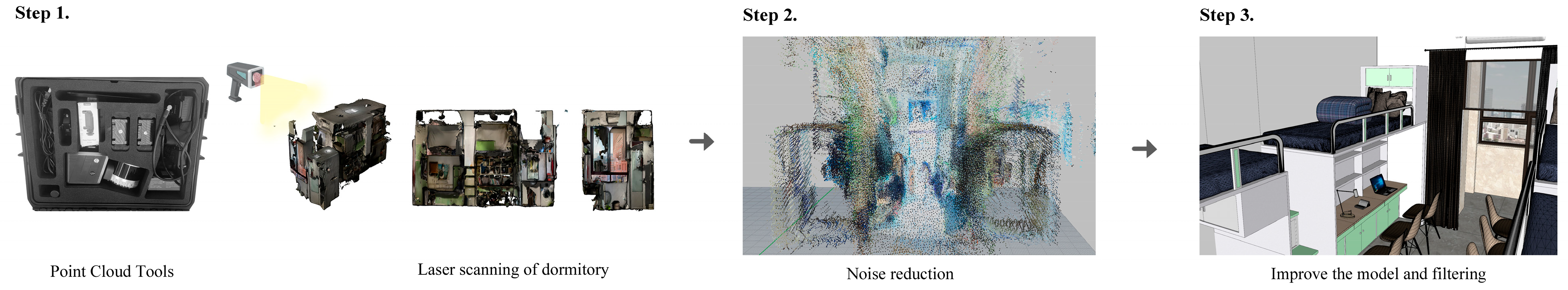 To achieve precise control over experimental conditions and mitigate confounding effects from uncontrollable real-environment factors (e.g., fluctuations in light, noise, temperature, and humidity), a virtual reality (VR) environment was employed. To this end, a typical dormitory from a Chinese university was randomly selected, and its interior space was scanned using point cloud technology to construct a high-fidelity dormitory spatial model. Point cloud scanning has become an important tool for high-precision reconstruction of indoor spaces, using active sensing devices like LiDAR to acquire 3D coordinates of the indoor environment, thereby constructing accurate spatial geometric representations [38]. This technology is particularly suitable for capturing detailed features of complex indoor environments, including furniture layout, structural elements, and spatial relationships, ensuring scene scale accuracy. A RobotSLAM scanner (RobotSLAM mobile laser scanner, South Surveying & Mapping Instrument Co., Ltd., Guangzhou, China), which uses Simultaneous Localization and Mapping (SLAM) technology to generate point cloud models in real-time without GPS signals, was employed to collect the geometric data. SLAM is widely used in fields such as Building Information Modeling and indoor spatial reconstruction [39,40]. Figure 1 illustrates the acquisition and processing workflow for point cloud scanning.