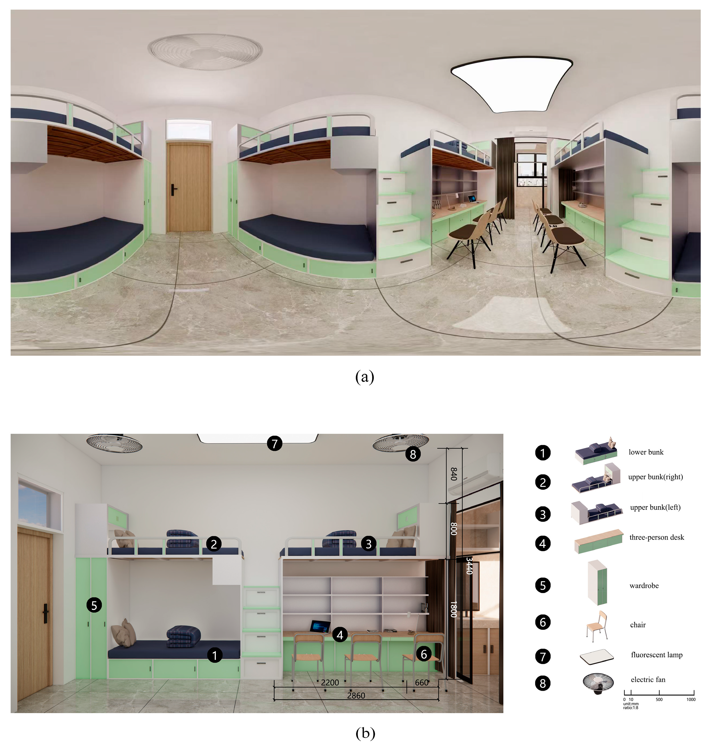 Figure 2. Rendered panoramic images of the virtual dormitory (a), and renderings of the dormitory and furniture (b).
