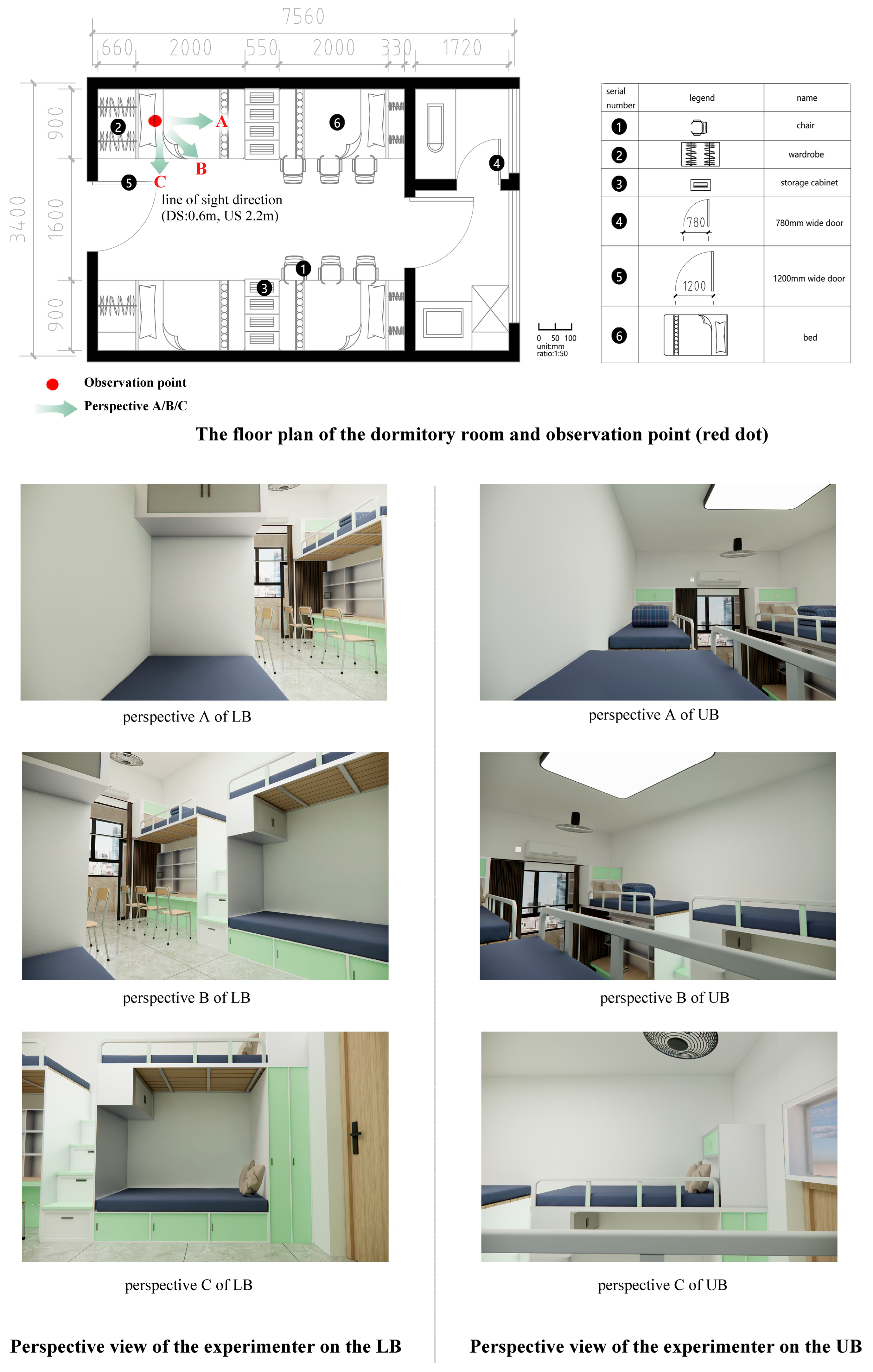 Figure 3. Dormitory plan and scenarios for the lower bunk (LB) and upper bunk (UB) setups.