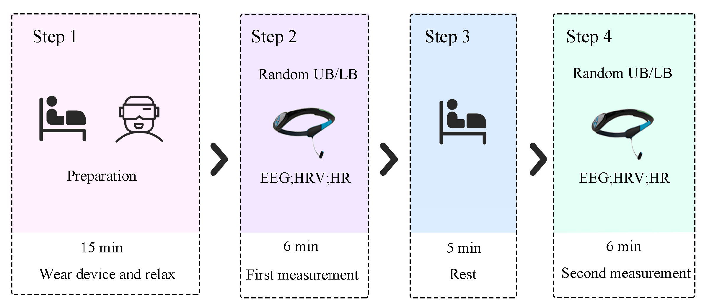 The physiological experimental procedure is shown in Figure 4 and described as follows: (1) As human adaptation to a new environment requires at least 15 min [46], participants sat quietly for 15 min to acclimatize. During this time, physiological monitoring devices and the VR headset were correctly fitted, ensuring signal stability. (2) Participants were randomly assigned to experience one of the two bunk perspectives (UB or LB) first. In the VR environment, participants were instructed to lie on the bed in the room and slowly turn their heads to observe the virtual scene from different angles for 6 min [47], while physiological data were recorded synchronously. (3) Participants removed the VR equipment and sat quietly with eyes closed for a 5 min rest to eliminate residual effects from the previous stimulus [36]. (4) Participants put the VR equipment back on, laid down, and slowly turned their heads to experience the other bunk perspective for 6 min, again recording physiological data.