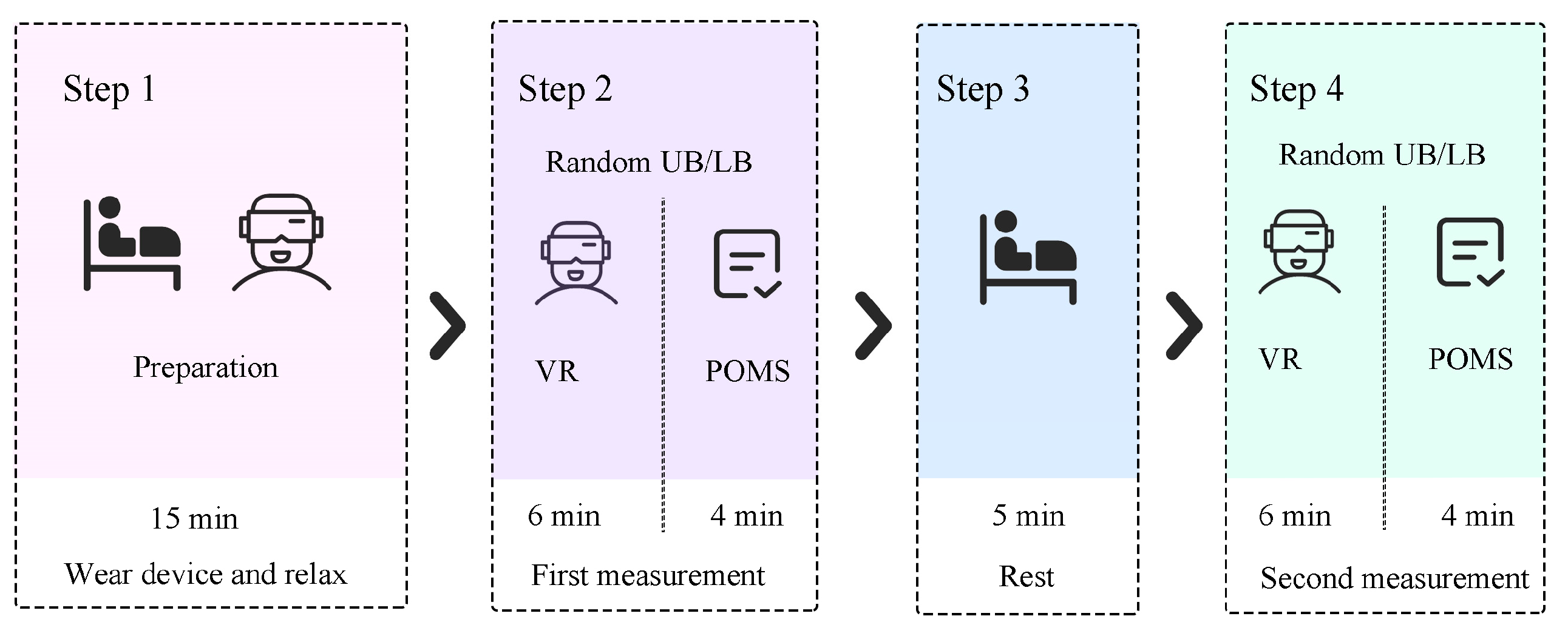 The psychological experimental procedure is shown in Figure 5 and described as follows: (1) Participants sat quietly for 15 min to acclimatize. Only the VR equipment was worn during this phase, without physiological sensors. (2) Participants were randomly assigned to experience one of the two bunk perspectives (UB or LB) first. Similarly to the physiological experiment, participants were instructed to observe the VR scene from different angles for 6 min. Immediately after the experience, they completed the POMS assessment with verbal assistance from researchers. (3) Participants removed the VR equipment and sat quietly with eyes closed for a 5 min rest. (4) Participants put the VR equipment back on, laid down, slowly turned their heads to observe the surroundings, experienced the other bunk perspective for 6 min, and completed the POMS assessment again.