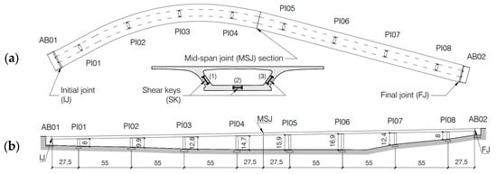 The case study structure—built in Italy in the late 1980s—is a post-tensioned concrete bridge with a total length of 440 m, subdivided in nine spans: the first and the last ones are 27.5 m long, while the inner spans are 55 m long. The deck of the bridge consists of a curved continuous concrete box girder on multiple supports, which was originally built with precast segments using the balance cantilever construction method. The box girder is divided into two parts of equal length, which are connected by a hinged joint in the middle of the central span (MSJ detail of Figure 1). More in detail, three steel shear keys are used: two of them are placed in the box web (details (1) and (3) in Figure 1), one each side, while the third one is placed in the bottom slab (detail (2) in Figure 1).