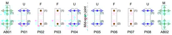 Plan view of the load-bearing devices. Arrows show the allowed displacements. M = multidirectional; U = unidirectional; F = fixed.