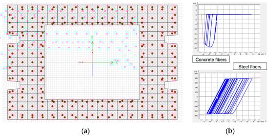 Fibre section at the base of the pier (a) and cyclic behaviour of concrete and steel fibres (b).