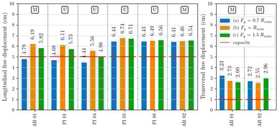 Longitudinal displacements of unidirectional (U) and multidirectional bearings (M), as well as transversal displacements of multidirectional bearings, were evaluated and compared to the nominal displacement limit specified in the design documentation of the bridge. The free displacement results of the load bearings are reported in Figure 8 for the three models assumed, labelled “a”, “b” and “c”.