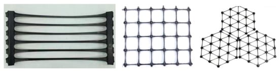 Geogrids are polymer-based reinforcement materials that enhance the shear strength of structures, such as embankments and retaining walls, by restraining soil particle displacement through interface friction and an interlocking mechanism. Depending on the engineering application, tensile geogrids are categorized into uniaxial, biaxial, and multi-axial types, as shown in Figure 1. Conventional geogrids of various shapes can enhance the soil stability to some extent; however, their designs have inherent limitations. Studies by Abu-Farsakh and Coronel and Ahmadi and Nikbakht showed that the uniform rib structure left approximately 30–40% of the material in a low-stress state [1,2]. Pan and Zhai pointed out that topology optimization could achieve a balance between lightweight design and high performance [3]. Geosynthetic reinforcement is a technique that enhances the performance of geotechnical structures by transferring tensile loads from the soil to the reinforcement. Consequently, the design of geogrid-reinforced systems is primarily governed by their tensile properties. Furthermore, the efficiency of the frictional and interlocking mechanisms at the geogrid–soil interface is a key criterion for evaluating geogrid performance. Tang et al. [4] and Ochiai et al. [5] confirmed that the pull-out test is a reliable method for assessing geogrid–soil interaction.