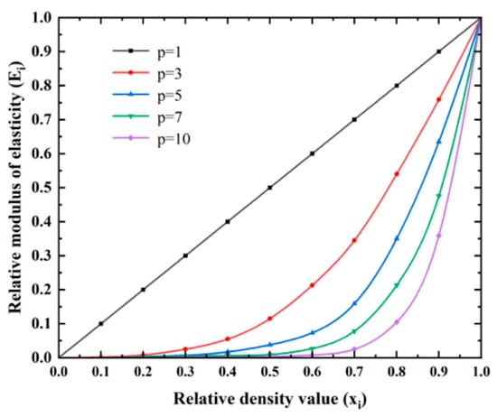 Figure 2 illustrates the influence of different penalty factors p on the SIMP Equation (1). The ordinate Eᵢ represents the ratio of E(xᵢ) to E0, denoting the relative elastic modulus. A larger value of p accelerates the convergence of the penalized relative elastic modulus Eᵢ towards 1 and 0, indicating that intermediate material densities in the optimized structure also converge toward these extremes. Therefore, it is necessary to select a suitable value for the penalty factor p, as a higher value does not necessarily yield a more precise optimization outcome. Wang and Zhu [15], in their topology optimization of continuum thin-shell structures, concluded that when the penalty factor p is set to 5.0, the model achieves a more thorough topology optimization, exhibits overall greater regularity, and ultimately attains the minimum compliance. Therefore, in this paper, the penalty factor p for the geogrid structure was taken as 5.0.