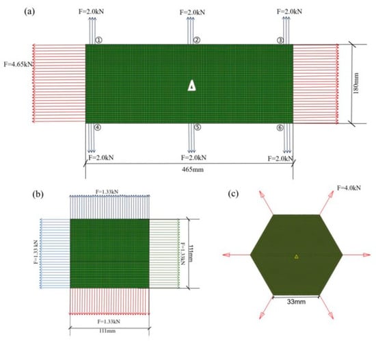 Figure 4c presents the finite element model depicting the load state for the topology optimization of a triaxial geogrid. Utilizing the model’s symmetry during meshing, the hexagonal model has a side length of 3.3 cm. The central node of the hexagon is fully constrained in all six degrees of freedom: UX, UY, UZ, ROTX, ROTY, and ROTZ. All other nodes in the model are constrained in UZ. Symmetrically concentrated tensile loads, each with a magnitude of 4.0 kN, are applied along the edges in the 0°, 60°, and 120° directions (oriented radially outward along their respective angles). Leveraging the cyclic symmetry of the hexagon, X-Z and Y-Z plane symmetry constraints are applied during optimization to simplify the calculations. The magnitude of the applied symmetrical concentrated forces is not dependent on the tensile force itself, but rather on the chosen loading method and direction.