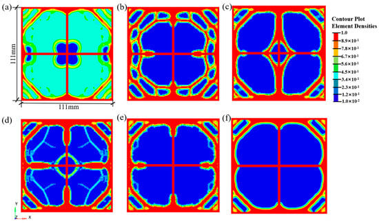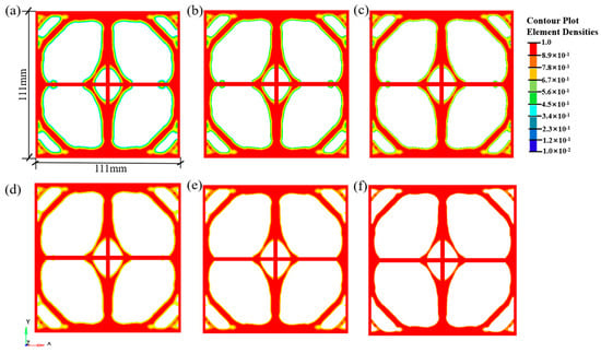 Density contour of the optimized geogrid structure under different volume fraction constraints for the biaxial geogrid: (a) Vfrac = 0.40; (b) Vfrac = 0.35; (c) Vfrac = 0.30; (d) Vfrac = 0.25; (e) Vfrac = 0.20; (f) Vfrac = 0.15.