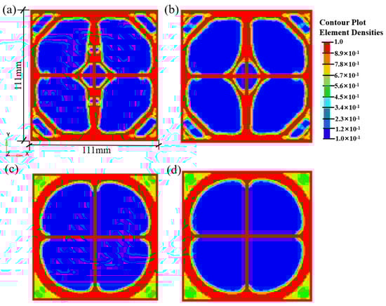 Density contour of geogrid structures with different minimum member sizes after optimization: (a) Mmindim = 4.5; (b) Mmindim = 5.0; (c) Mmindim = 5.5; (d) Mmindim = 6.0.