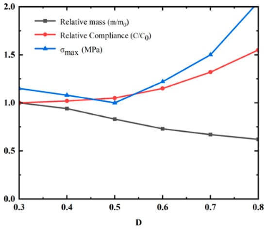 As the element density threshold D increases, the amount of material retained after structural optimization decreases. However, an excessively high density threshold leads to discontinuous structural components and localized stress concentration, as shown in Figure 8f. This study exported geometric models for the biaxial geogrid optimized under a volume fraction Vfrac = 0.3, applying density thresholds D ranging from 0.3 to 0.8. For each model, the following metrics were calculated: Relative mass (m/m0): The ratio of the exported model’s mass to the mass of the original design domain. Relative compliance (C/C0): The model was imported into FLAC3D, subjected to the same biaxial tensile loads used in the optimization, and its compliance was calculated. This value was then compared to the compliance of the model at D = 0.3. Maximum Principal Stress (σmax): The maximum principal stress value extracted from the same FLAC3D tensile analysis. As shown in Figure 9, within the D range of 0.4 to 0.6, the structures achieved significant lightweighting while maintaining good connectivity and manufacturability. Simultaneously, the increases in compliance and stress were controlled at acceptable, relatively low levels (<15%). At D = 0.5, an optimal balance between performance retention and lightweighting was achieved.