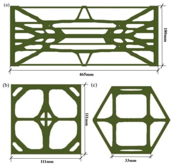 Optimized topological configurations of three geogrids at a density threshold of 0.70. (a) Topologically optimized configuration of uniaxial geogrid; (b) Topologically optimized configuration of biaxial geogrid; (c) Topologically optimized configuration of triaxial geogrid.