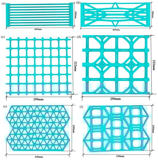 Geogrid models imported into FLAC3D: (a) Conventional uniaxial geogrid; (b) Topologically optimized new uniaxial geogrid; (c) Conventional biaxial geogrid; (d) Topologically optimized new biaxial geogrid; (e) Conventional triaxial geogrid; (f) Topologically optimized new triaxial geogrid.