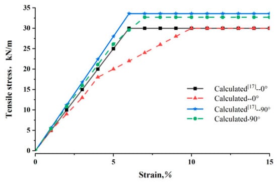 To simulate laboratory tensile tests, Dong and Han [18] selected biaxial geogrids based on the aperture sizes of commercially available products and determined a mesh size of 330 mm × 200 mm. The mesh was fixed to prevent movement in both the x and y directions. An equal velocity at 5 × 10−8 m/step was applied horizontally on each node on the right boundary with an increasing magnitude until the failure of the sample. The right boundary could only move in the x direction but not in the y direction. The right boundary did not allow any rotation either. This boundary was created to simulate a clamp in a laboratory test. The top and bottom boundaries of these meshes were free for displacements in the x and y directions. In this paper, the same method was used, applying tensile force to conventional biaxial geogrids with identical mesh dimensions in the 0°and 90°directions, respectively, and the numerical simulation results were compared. Figure 12 shows the comparative results, indicating that for both the 0° and 90° directions, the numerical results exhibited reasonable consistency in terms of tensile stiffness and ultimate tensile strength. The horizontal line denotes the peak load capacity of the geogrid. After this point, the geogrid may retain some load-carrying capacity, but at a lower level. Tensile stiffness and ultimate tensile strength are key parameters in geogrid tensile tests and are used in design.