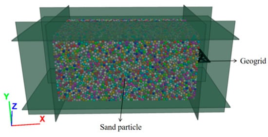 Coupling model of PFC3D–FLAC3D for pull-out test: The dimensions of the numerical soil model (length × width × height of 420 mm × 220 mm × 200 mm) and the dimensions of the geogrids (length × width × thickness of 485 mm × 131 mm × 2 mm).