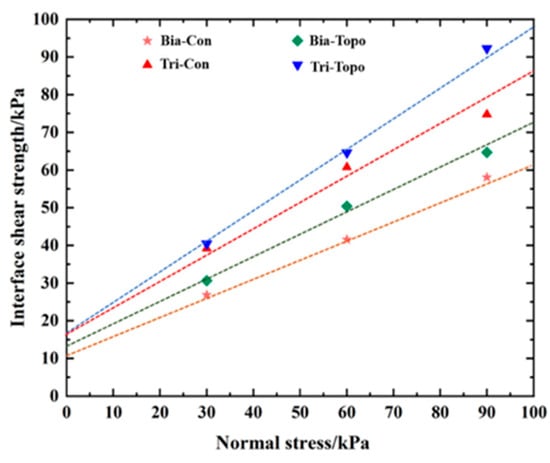Based on the pull-out test results, the relationship curves between normal stress and maximum shear stress for geogrids with different aperture shapes were plotted. Figure 22 shows the resulting shear strength envelope for the standard sand–geogrid interface, where the inclination angle of this line represents the interface friction angle φsg between the sand and the geogrid.