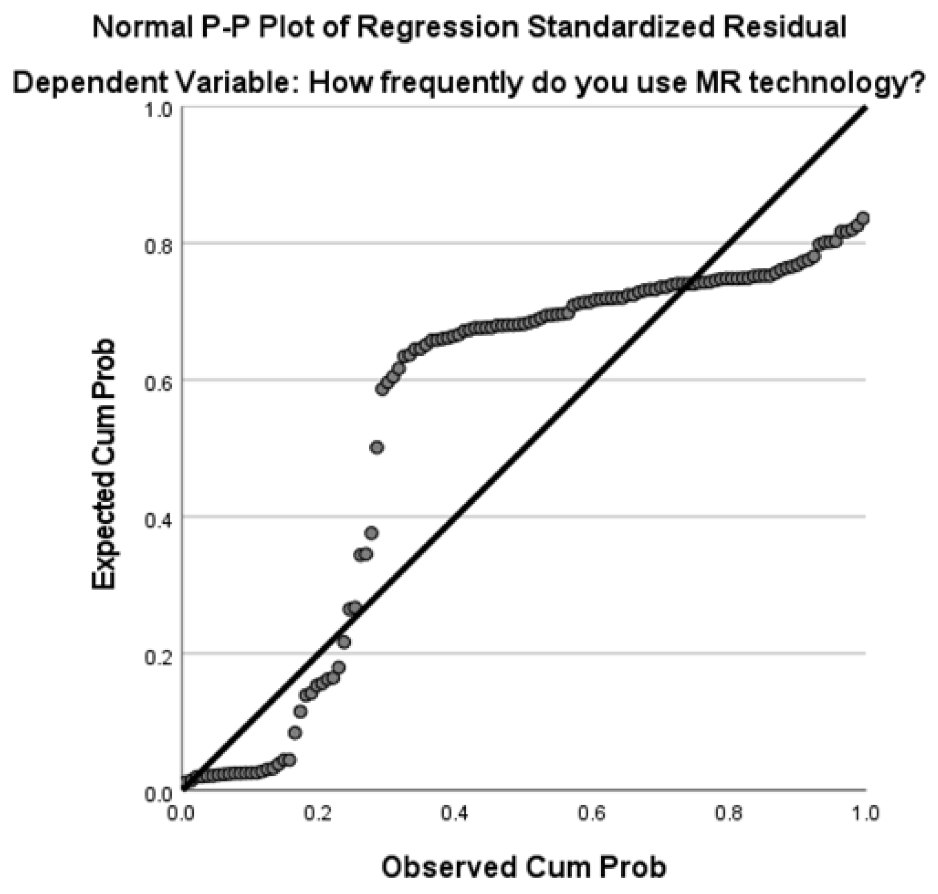 Figure 2 is presented to visually assess the normality assumption of regression residuals. Ideally, the observed values should align closely with the diagonal line, indicating that the residuals are normally distributed. In this plot, noticeable deviations, especially at the lower and upper tails, suggest that the residuals are not perfectly normal. This lack of normality could weaken the reliability of statistical inferences in the regression model. Moderate deviations are often acceptable in larger samples. While some deviation is observed, such patterns are not uncommon in exploratory survey based studies and are therefore interpreted with caution.