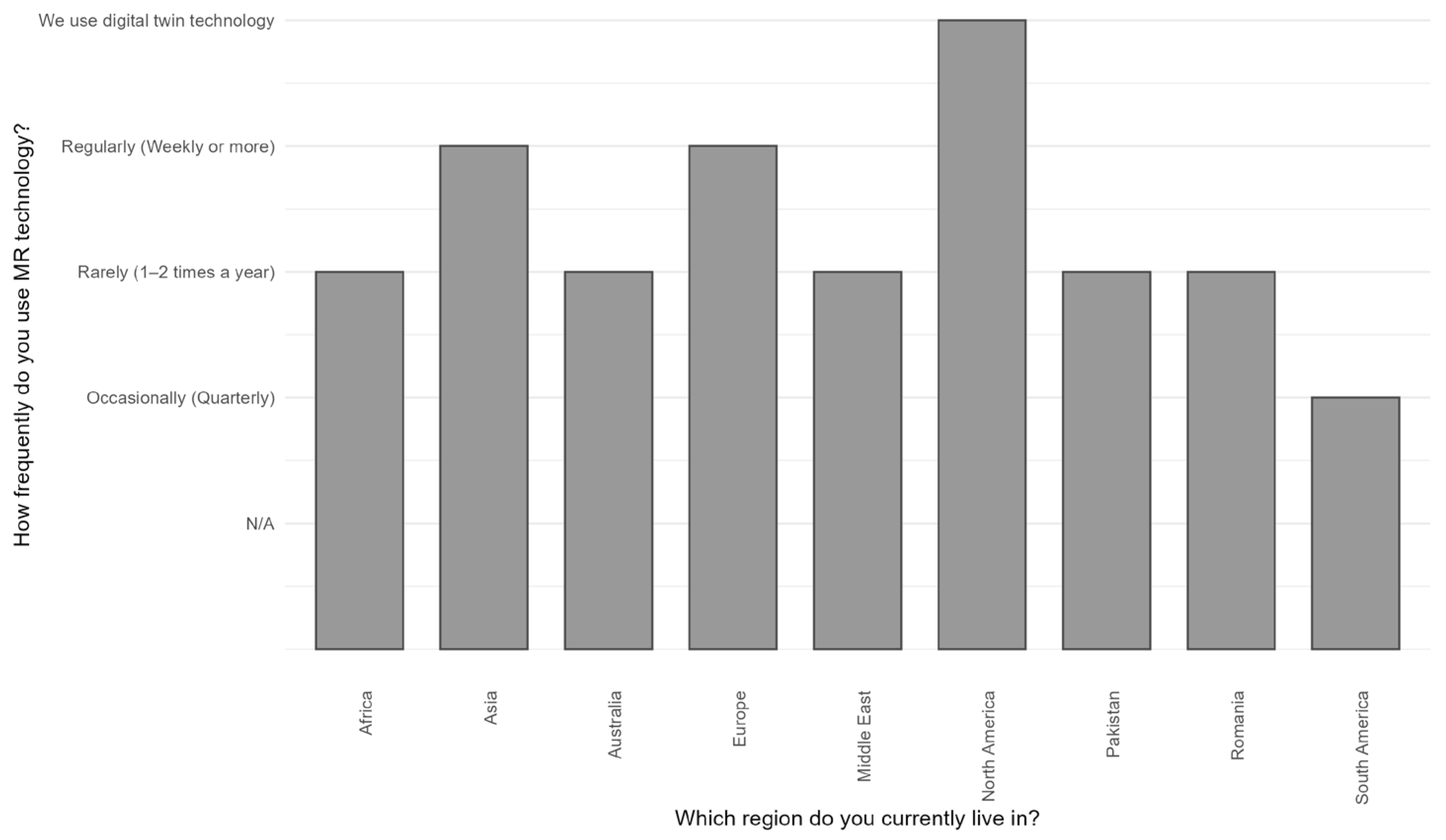 The Pearson Chi square value was χ2 (136) = 115.4 with a p-value of 0.899, which is well above the commonly accepted threshold of 0.05 for statistical significance. This suggests that there is no significant correlation between geographic regions and the frequency with which respondents reported using MR technology. In other words, MR usage patterns appear to be relatively uniform across regions like Asia, Europe, North America, Australia, and others within the sample.
