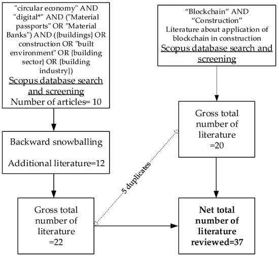 The literature search for this review was initiated by conducting a keyword search in the Scopus database using the following keyword string: “circular economy” AND “digital*” AND (“Material passports” OR “Material Banks”) AND ({buildings} OR construction OR “built environment” OR {building sector} OR {building industry}). The keyword search was limited to title, abstract, and keywords. This keywords string was intended to find the literature related to material passports based on DTs in the construction industry. As publications relevant to digitalisation and material passports have started only few years ago, from the late 2010s, the articles selected were from 2019 up to the time of the search, i.e., October 2025. The Scopus database was adopted because it is the largest database, and generally includes all recent publications [35]. Given the recency of the research topic, the Scopus database provides an exhaustive list of literature to be reviewed. As mentioned above, the selection criteria for the literature related to the application of DTs and MPs for circularity in construction were adopted. After reviewing the abstract and the relevant literature was selected from the obtained list. The initial list obtained after search contained sixty articles, and after screening, ten articles were reviewed in detail. Using the snowballing technique, the citations related to information relevant to this study in those articles were screened and selected to add to this review. Initially, around fifty articles were listed and then screened to select twelve comprising both academic and grey literature. The grey literature, including reports and standards, was about the use of DTs for information management and the purpose of material passports in construction.