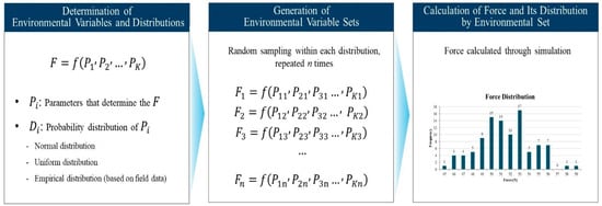 Figure 1 illustrates the conceptual framework of the proposed approach, from the definition of environmental variables to the generation of force distributions. First, key environmental variables that affect the required operational force are identified, and the functional characteristics and value ranges of each variable are defined. Probability distributions are then assigned to individual variables, and random sampling is performed to construct an environmental variable dataset that reflects diverse site conditions. Using the generated combinations of environmental variables as input, task simulations are conducted to calculate the required operational force under each condition, thereby constructing a force dataset corresponding to environmental variability.