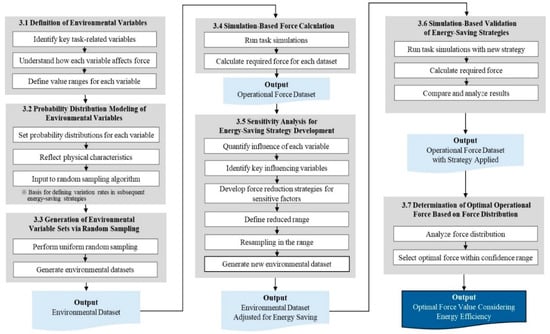To clarify the procedural flow of the proposed framework, the overall methodology can be summarized as a sequential seven-step workflow. First, key task-related environmental variables are identified and their physical influence on the required operational force is defined (Section 3.1). Second, probability distributions are assigned to these variables to represent environmental uncertainty (Section 3.2). Third, environmental variable sets are generated through random sampling based on the defined distributions (Section 3.3). Fourth, simulation-based force calculation is performed for each environmental dataset to obtain the corresponding operational force (Section 3.4). Fifth, sensitivity analysis is conducted to quantify the influence of individual variables and identify key factors for force reduction (Section 3.5). Sixth, energy-saving strategies are applied and validated through re-simulation under modified variable distributions (Section 3.6). Finally, the optimal operational force is determined based on the resulting force distributions and confidence levels (Section 3.7). This structured workflow enables readers to clearly follow and reproduce the proposed procedure.