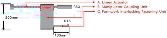 The automation device consists of three main components. A. Linear Actuator serves as the primary actuation unit that directly generates the tensile force required to pull the aluminum formwork during the removal process. The actuator converts motor-driven rotational motion into axial force through a lead screw mechanism. B. Manipulator Coupling Unit connects the linear actuator to the fastening unit and transmits rotational motion, thereby coordinating the operation between components. C. Formwork Interlocking Fastening Unit is inserted into the removal hole of the aluminum formwork and mechanically interlocks with the formwork, providing stable fixation between the device and the formwork during the removal process and ensuring operational stability.