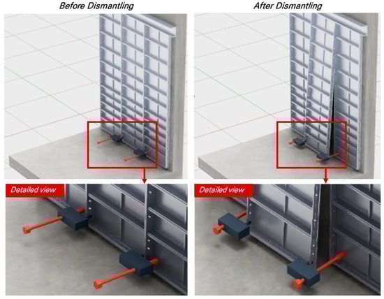To address these limitations of conventional removal methods, this study reconstructs the aluminum formwork removal task as a robot-oriented automation scenario and aims to derive the optimal operational force required for task execution through simulation-based analysis. Figure 4 illustrates an automated removal process in which three aluminum formwork panels are installed, and the central panel is removed. The left image shows the formwork interlocking fastening unit engaged with the removal hole of the aluminum formwork, while the right image depicts the separation of the lower part of the formwork as the lead screw mechanism is actuated by the internal motor.