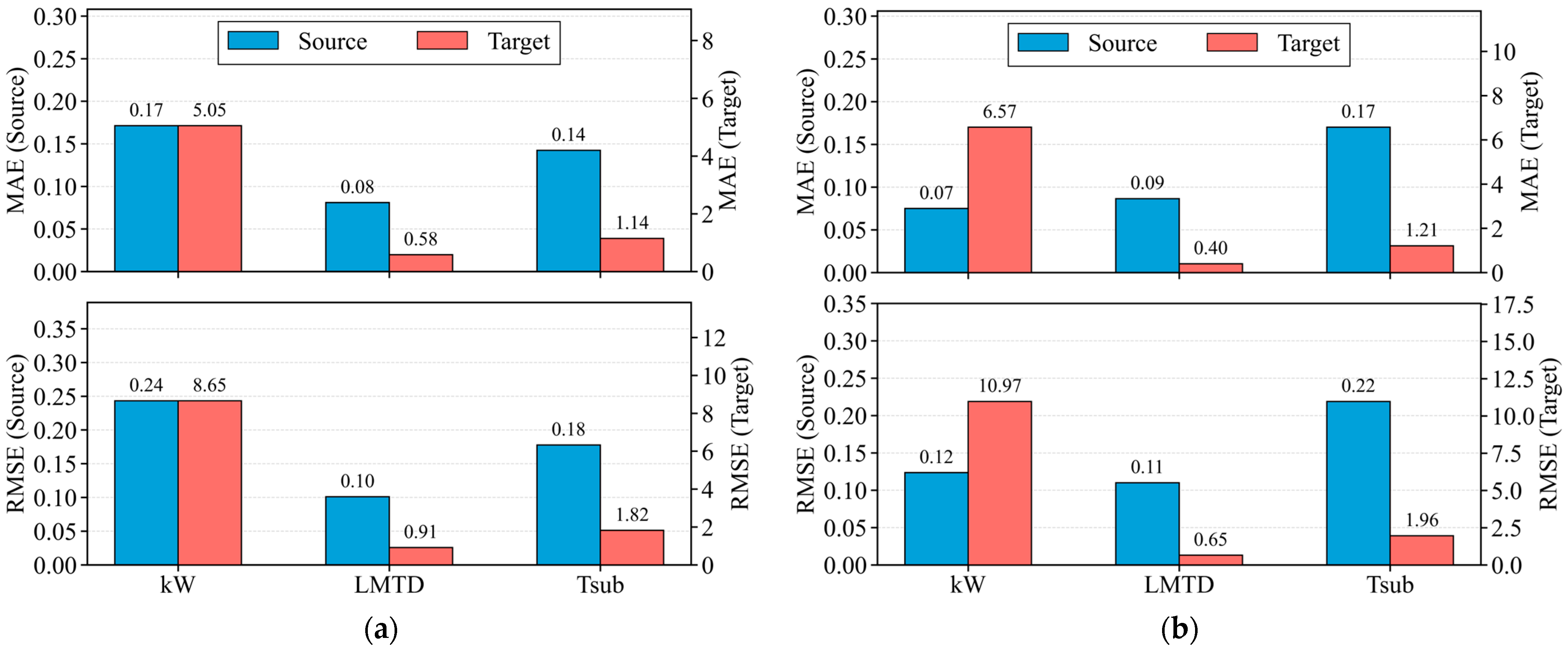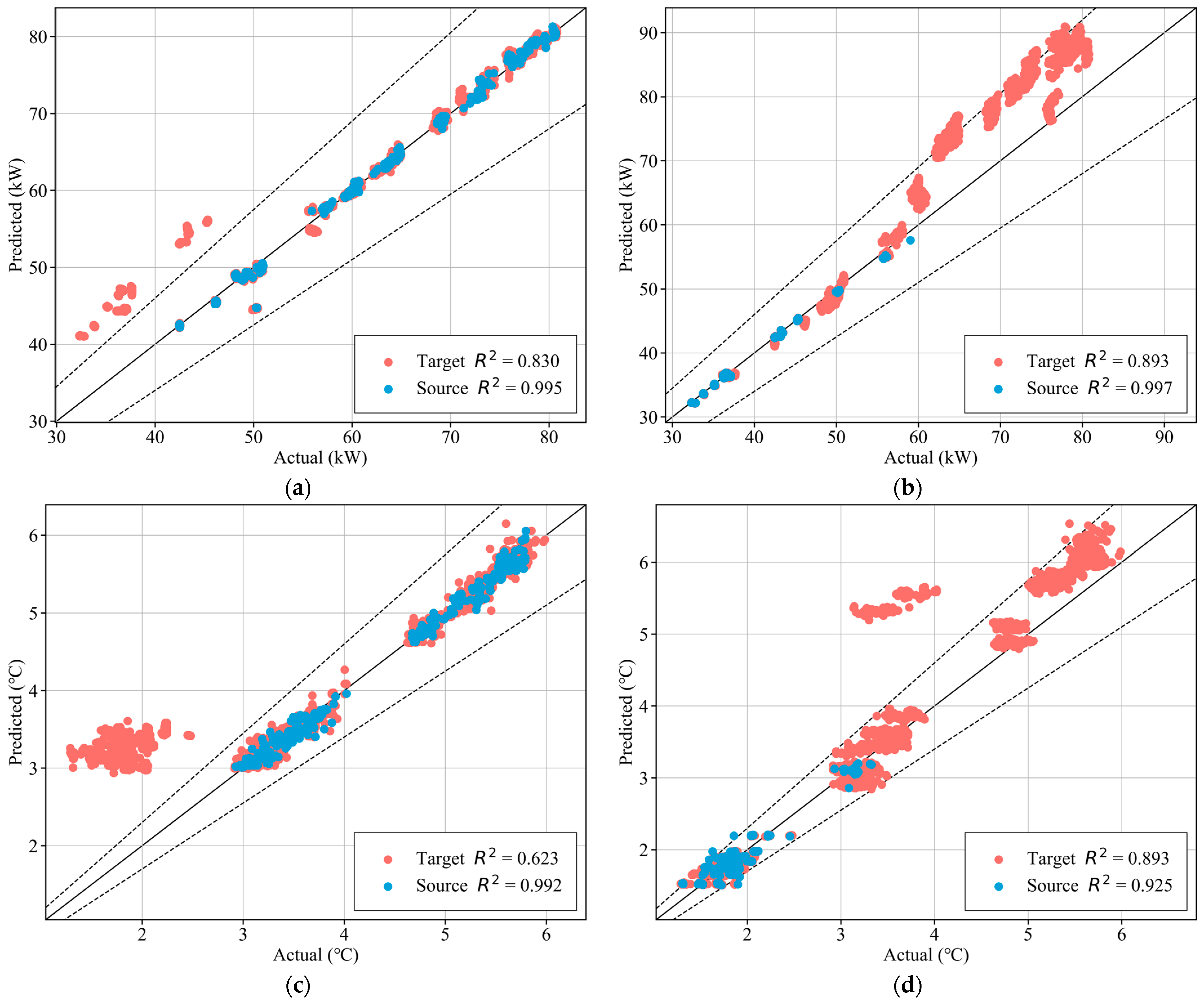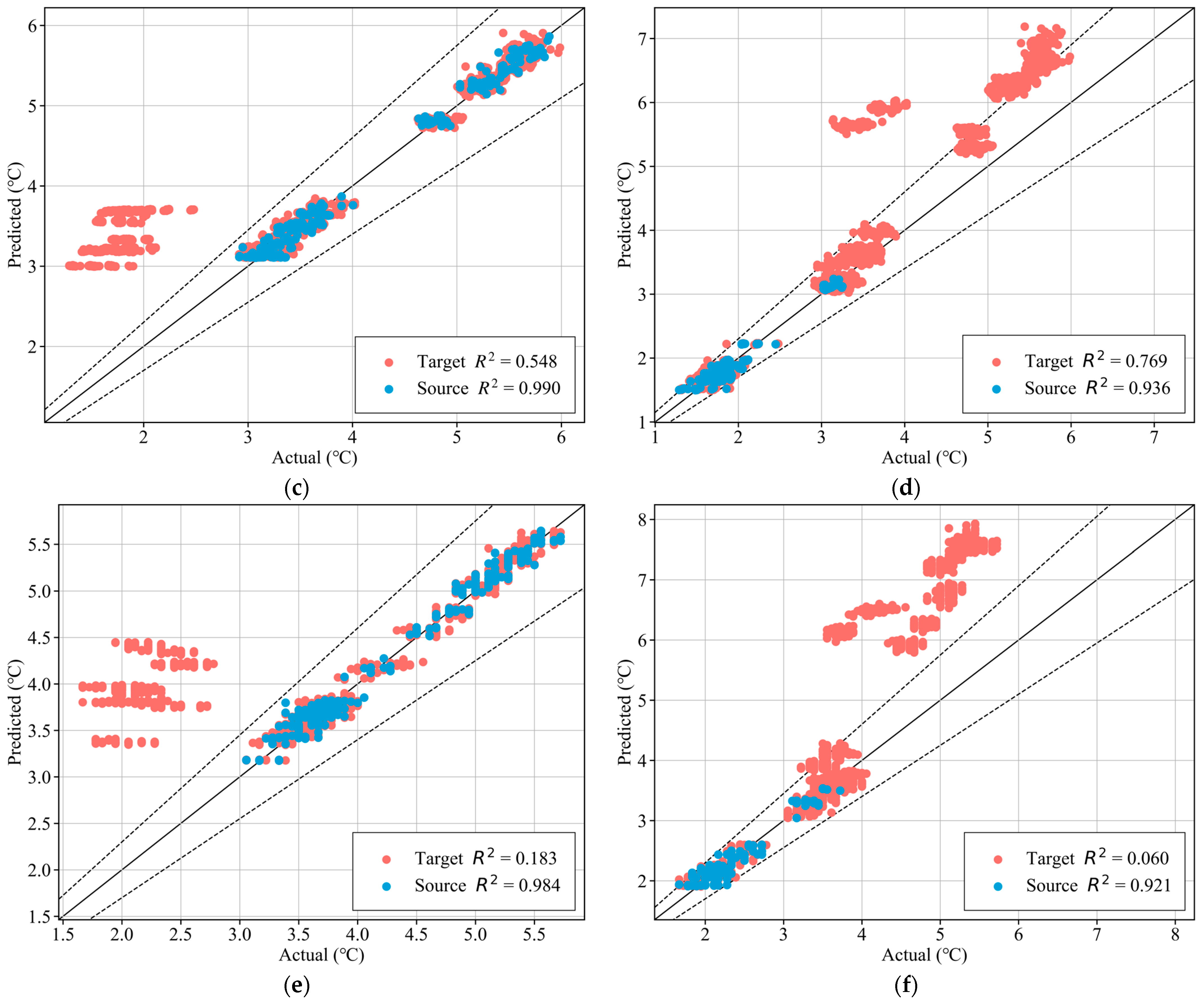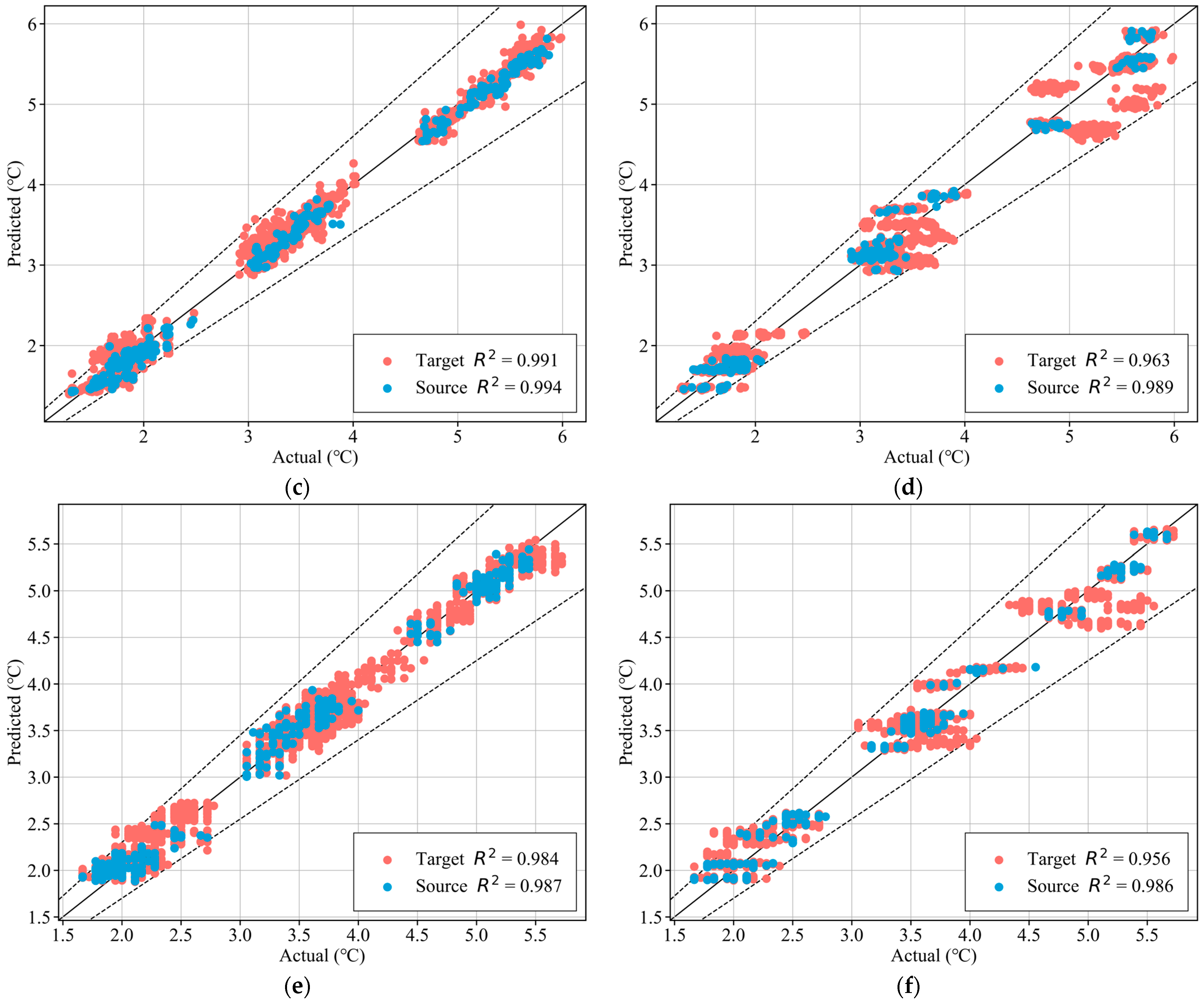 - The proposed CNN-GRAM model effectively overcomes the limitations of traditional data-driven models, which typically suffer from performance degradation when operating conditions shift. By aligning the feature distributions, the model achieves high predictive accuracy on the target domain without requiring labeled data for the new operating conditions. This modeling approach is equally applicable to other tasks, such as forecasting cooling and heating loads in air-conditioning systems, as both are regression tasks that are constrained by limited and low-quality historical data.