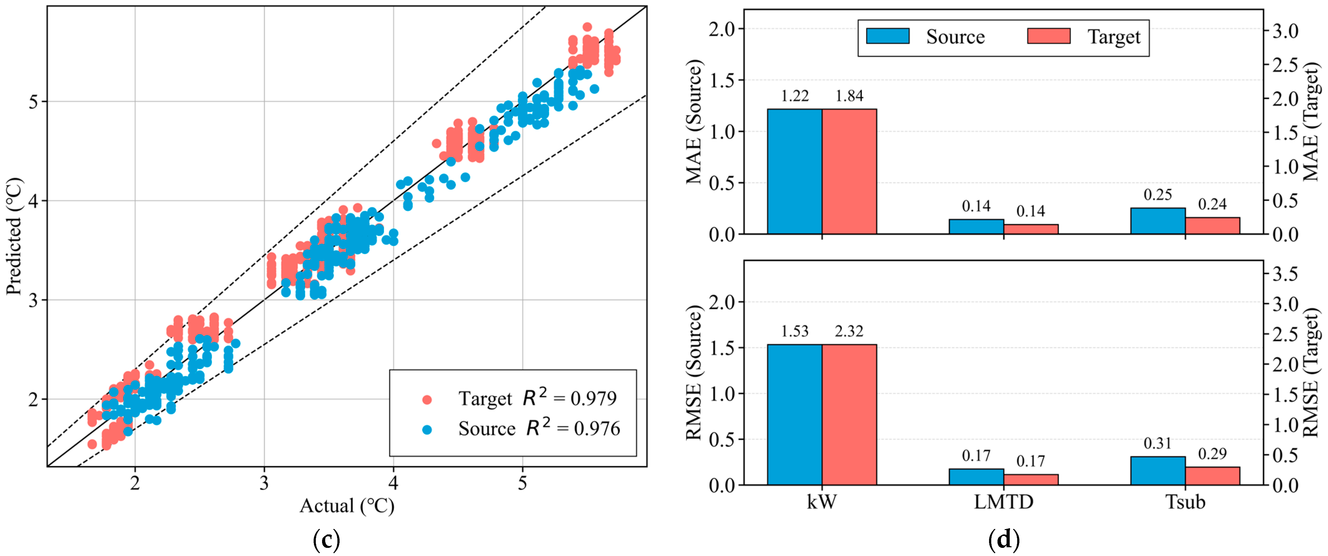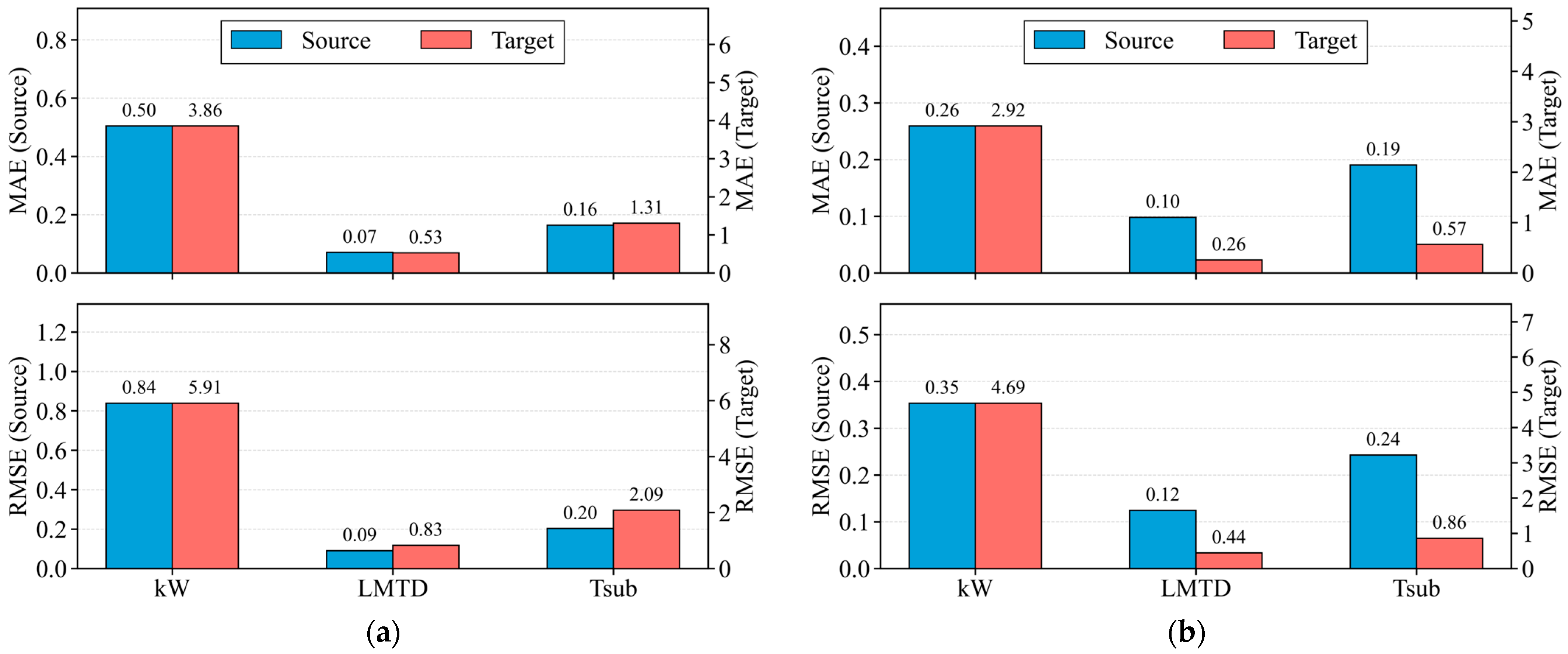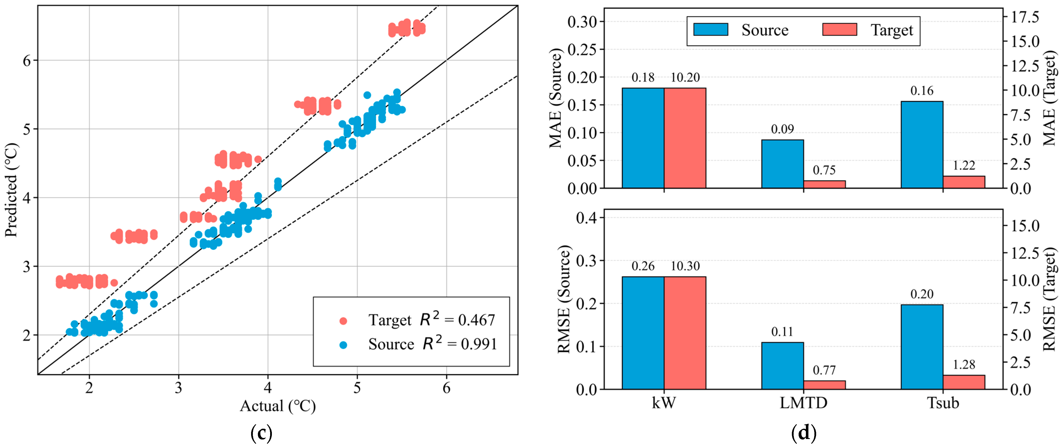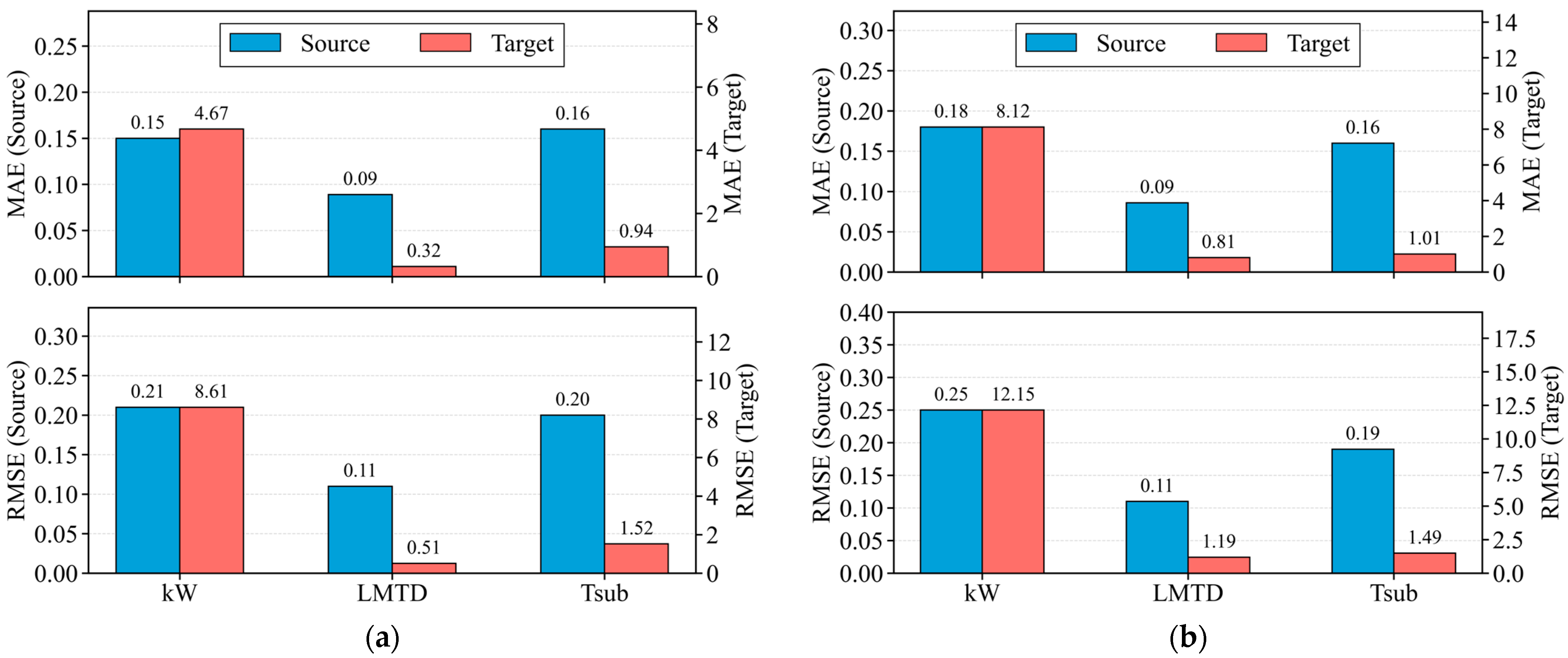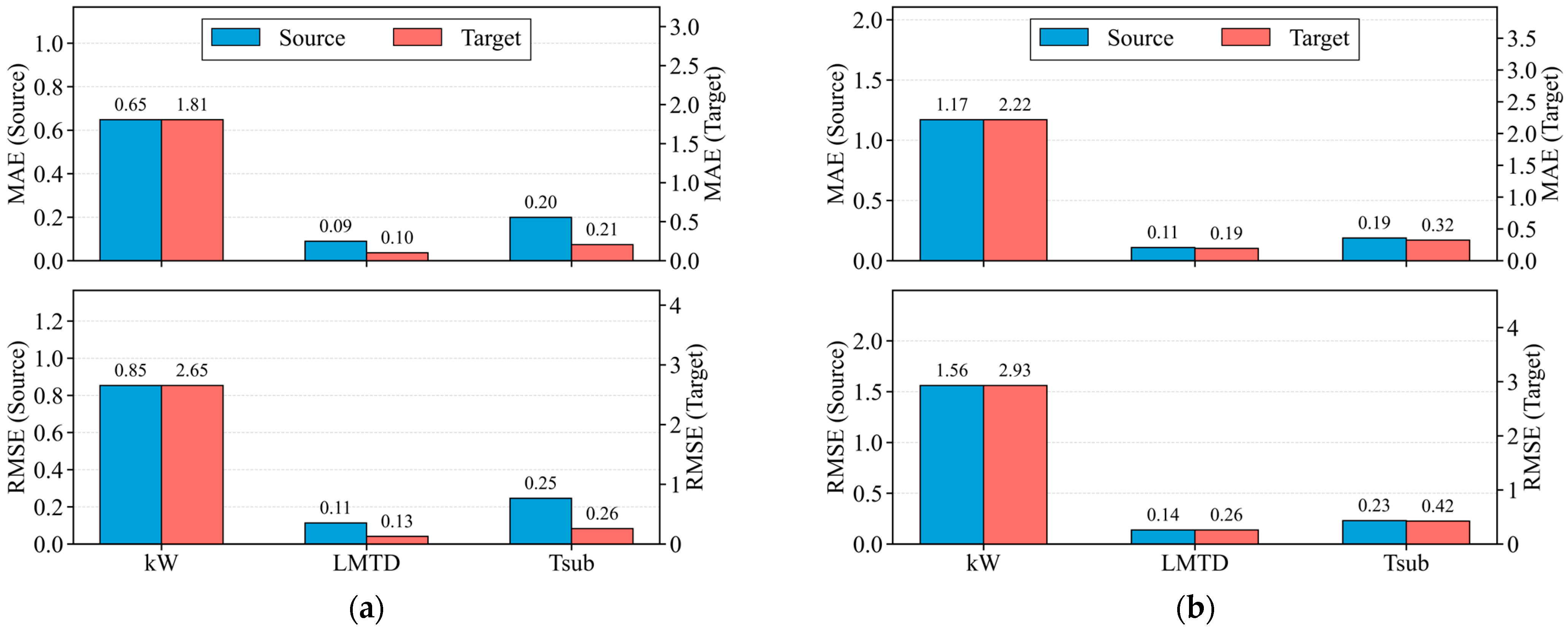 - The proposed CNN-GRAM model effectively overcomes the limitations of traditional data-driven models, which typically suffer from performance degradation when operating conditions shift. By aligning the feature distributions, the model achieves high predictive accuracy on the target domain without requiring labeled data for the new operating conditions. This modeling approach is equally applicable to other tasks, such as forecasting cooling and heating loads in air-conditioning systems, as both are regression tasks that are constrained by limited and low-quality historical data.