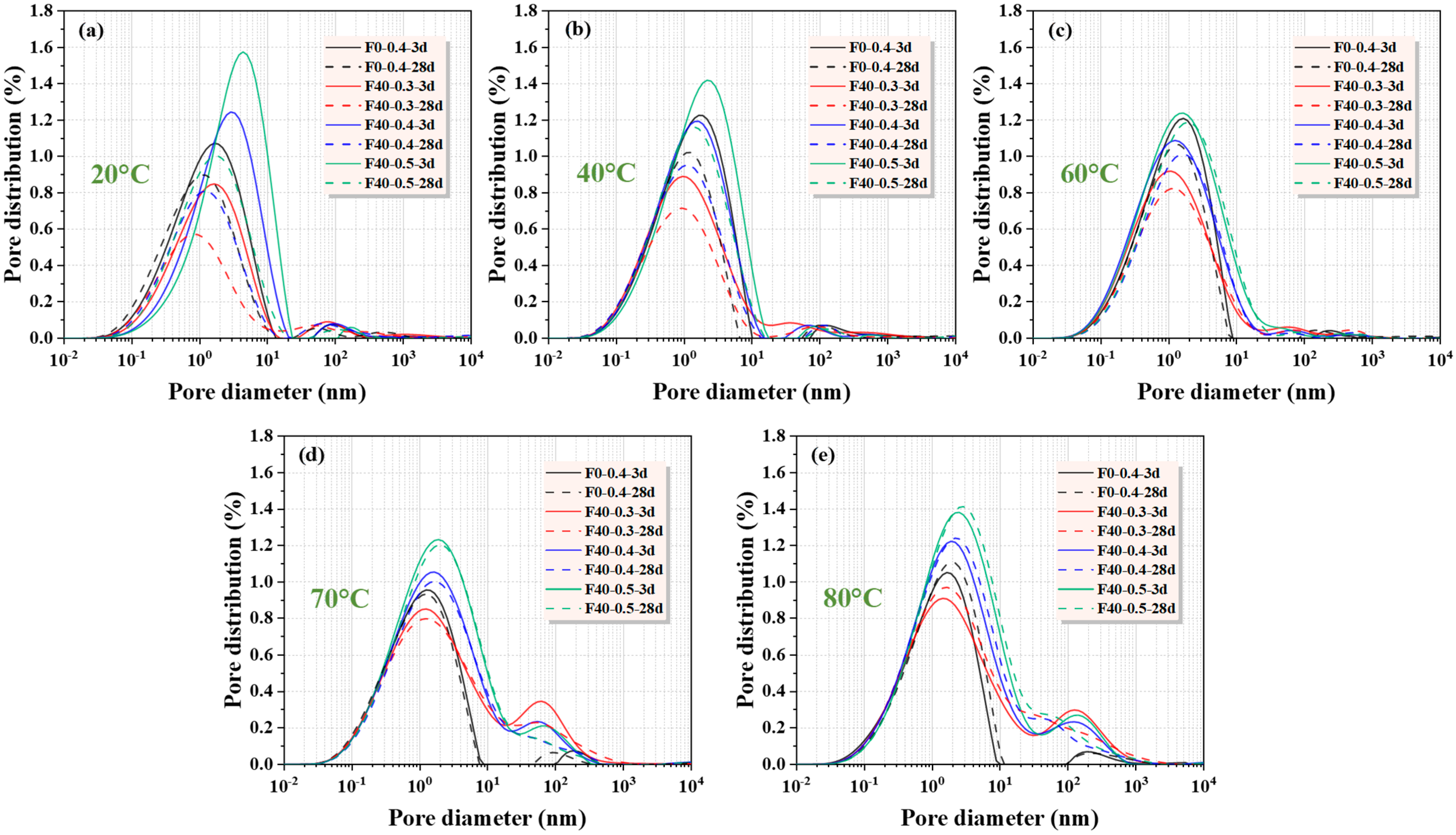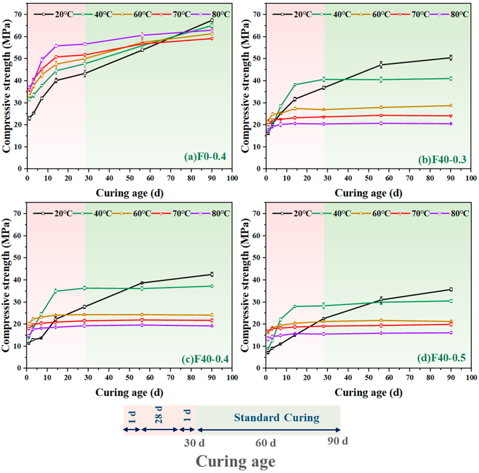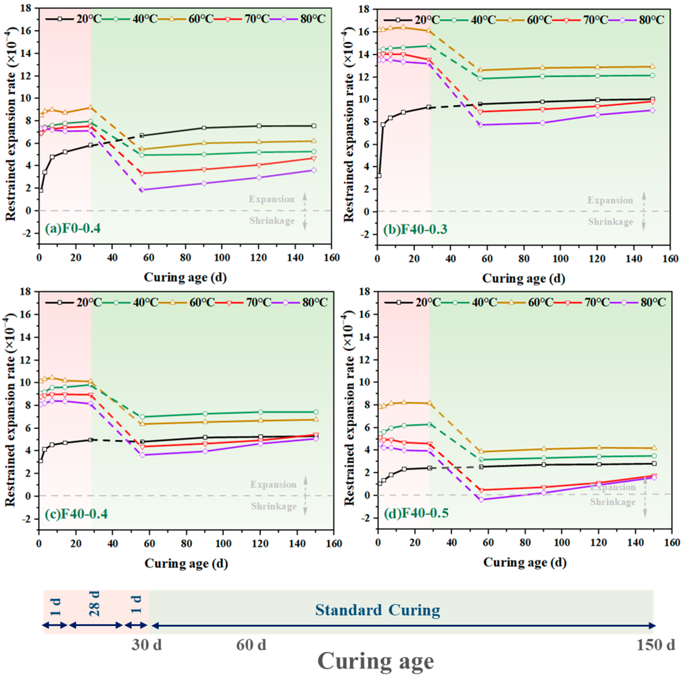 - FA and w/b ratio play modulating roles. FA suppressed later-age expansion at ambient temperature but could enhance expansion stability within the 40–60 °C range. However, at temperatures ≥ 70 °C, FA exacerbated pore coarsening and was detrimental to strength development. Increasing the w/b ratio generally reduced both the expansion ratio and strength but increased the resistance to DEF after high-temperature curing.