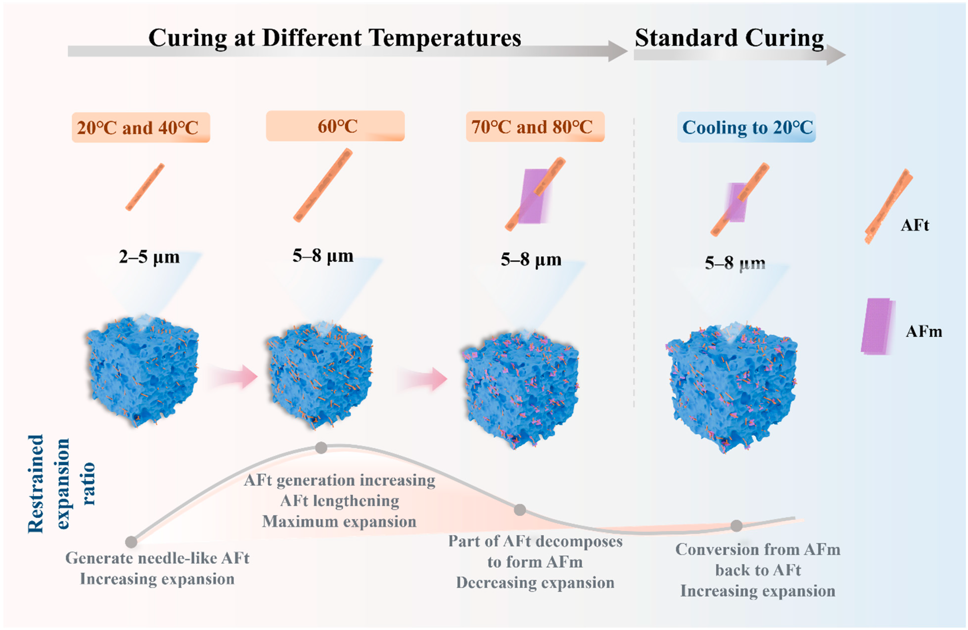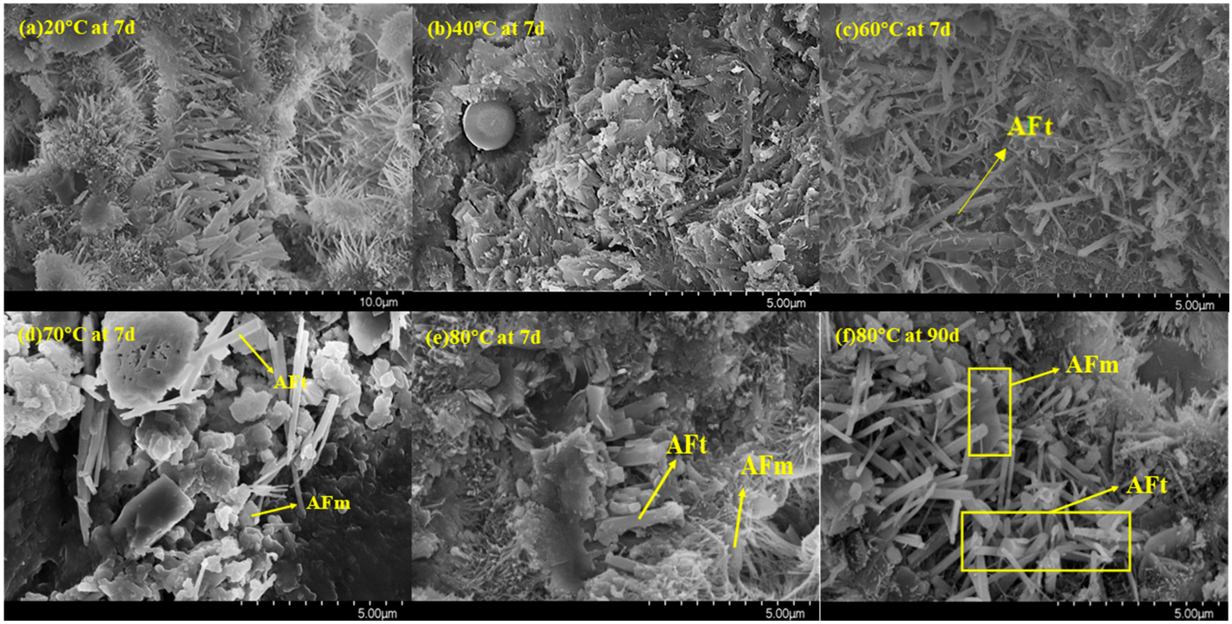 - A critical performance threshold of approximately 60 °C governs expansion behaviour, fundamentally linked to the thermal stability of AFt. The restrained expansion ratio peaked at 60 °C, corresponding to the maximum AFt content measured by XRD. At temperatures ≥ 70 °C, the thermal decomposition of AFt into AFm occurred, leading to a significant attenuation of expansive capacity. This phase change was directly observed via SEM, showing the formation of AFm crystals and a morphological transition of AFt from needle-like to prismatic forms.