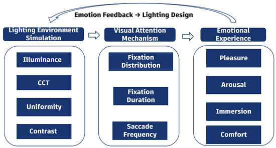 This procedure provides a structured way to examine the effects of lighting configuration on spatial emotion and visual behavior. The experimental steps are summarized in Figure 2. Analysis is conducted by relating physical lighting conditions to perceptual responses and emotional outcomes based on quantitative data.