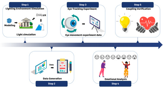 Experimental workflow integrating lighting simulation, eye-tracking, and emotional evaluation.