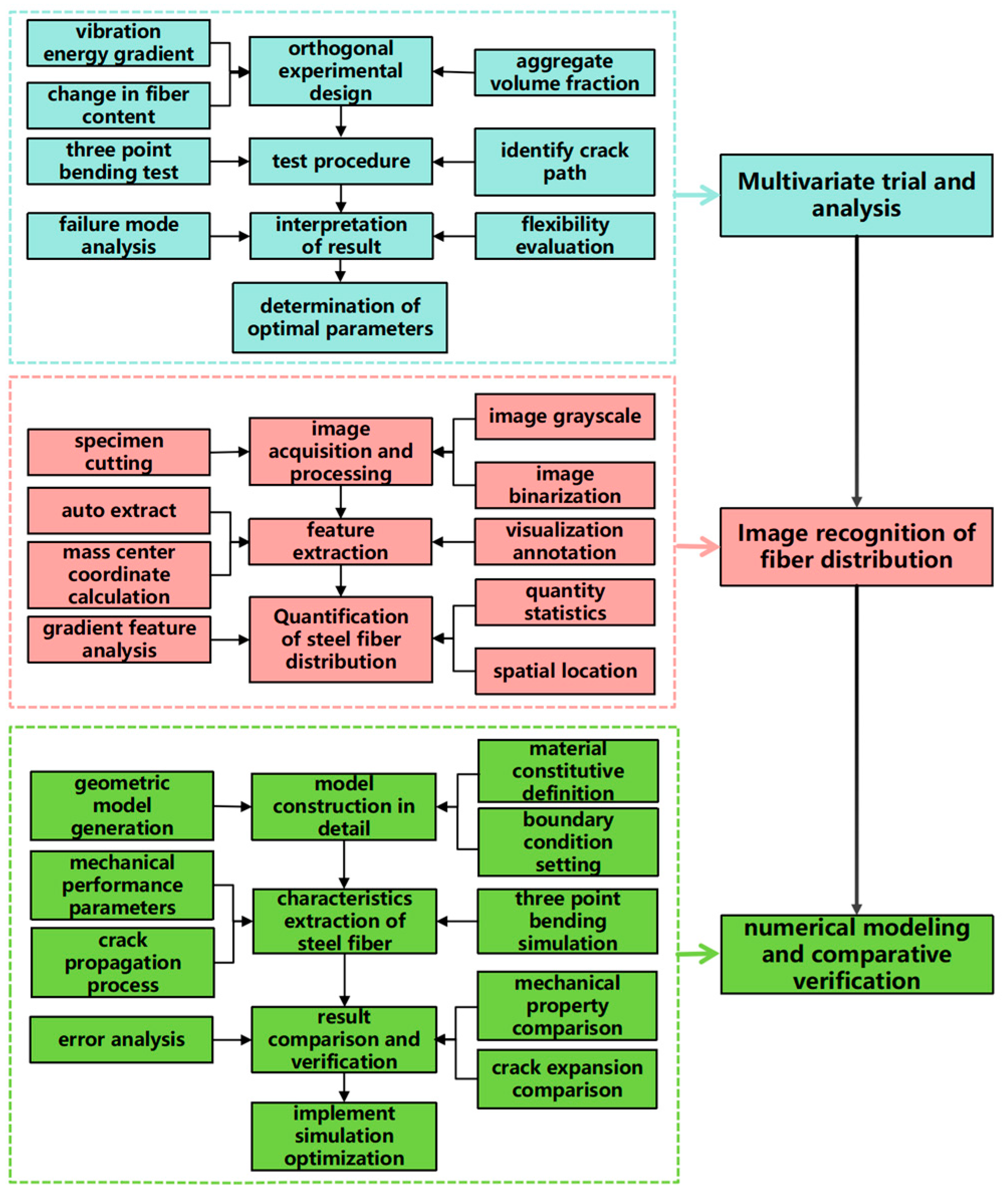 - To quantitatively analyze the effects of key construction process parameters (vibration energy, fiber dosage, aggregate volume fraction) on the actual spatial distribution of steel fibers in cast beams.