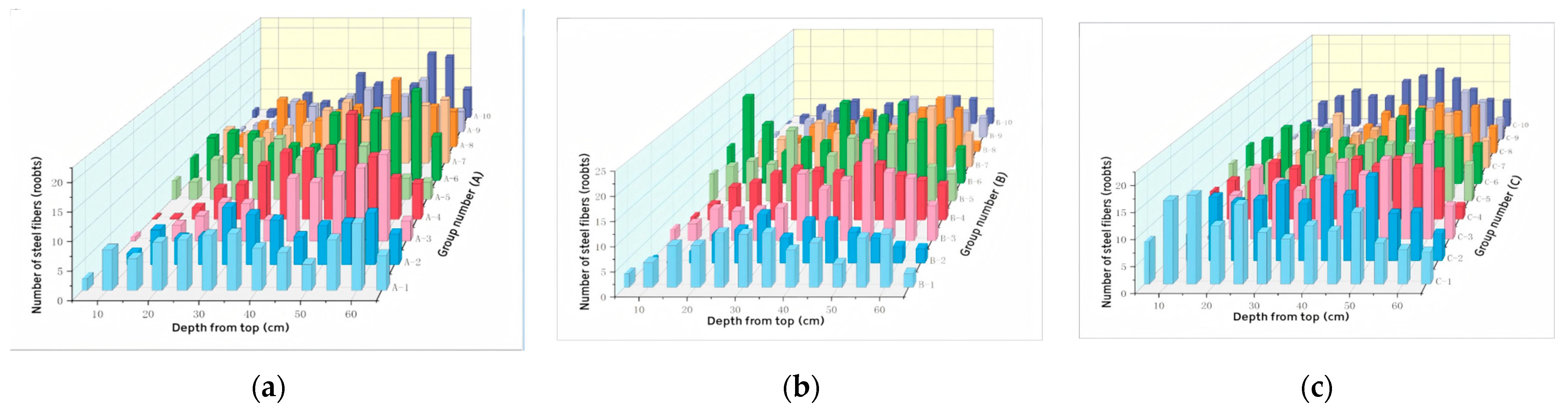 - Stratified Quantitative Statistics aims to quantify the distribution pattern of fibers across the specimen cross-section. The beam specimen with a total height of 65 cm is divided into 5 cm segments, and the number of fibers in each layer is counted. Representative data are shown in Table 2.